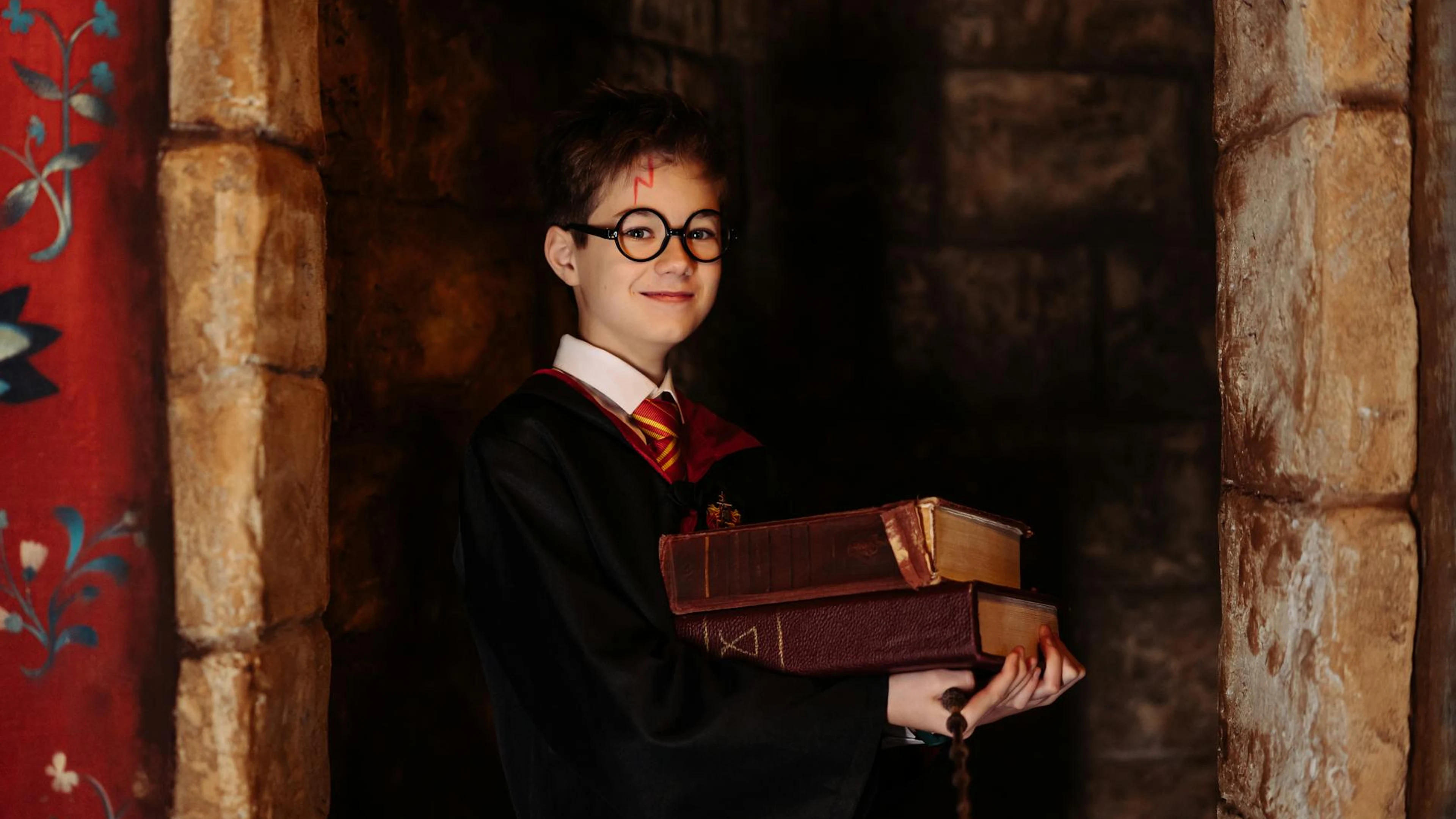 A young child in wizard costume inspired by popular culture, holding spellbooks,