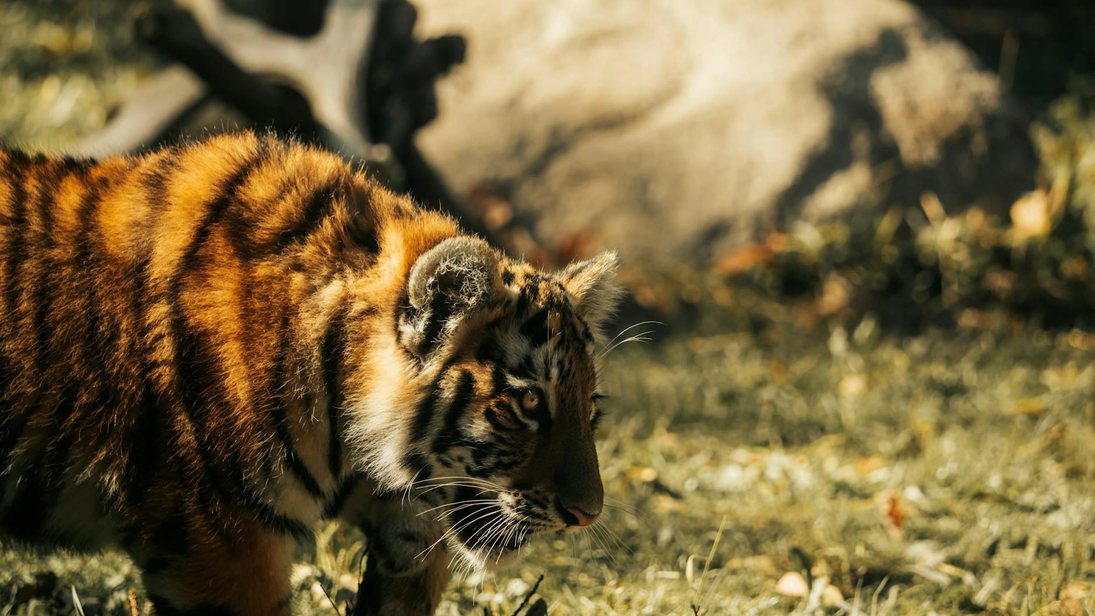 Free A young tiger gracefully walks in a sunlit wildlife habitat, showcasing its stri wallpaper in 4K Ultra HD resolution (3840x2160). Beautiful anime background for your screen. No signup required.