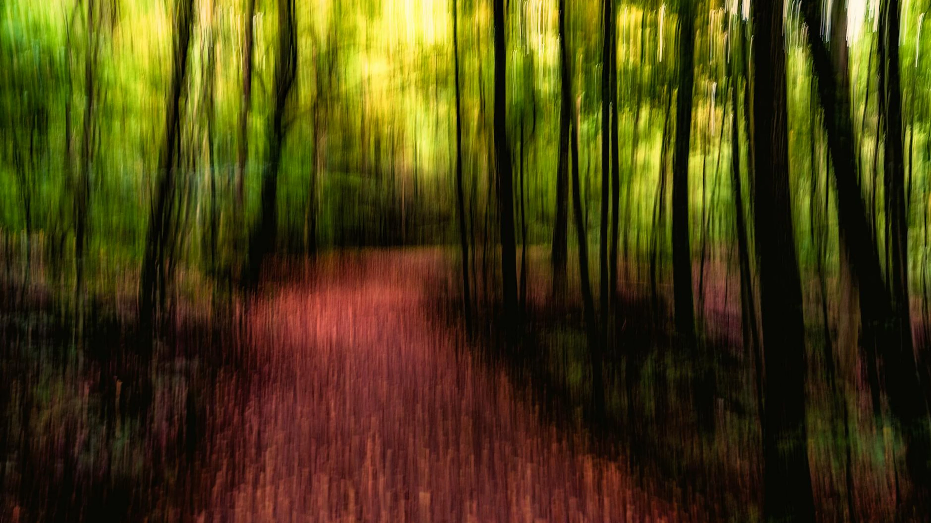 Abstract motion blur forest creating a dreamlike effect with rich earthy tones.