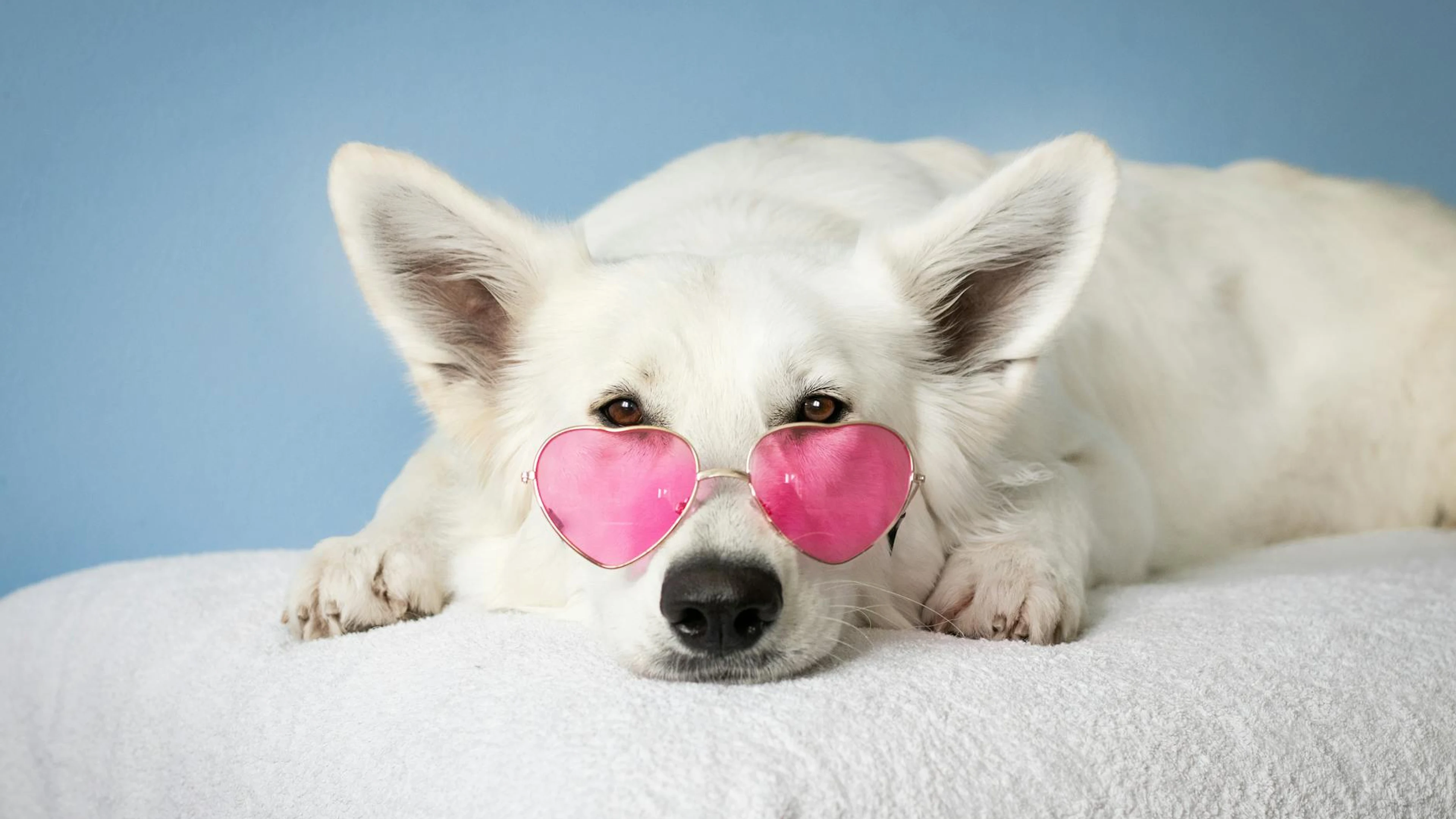Get this stunning Adorable white dog wearing pink heart sunglasses on a soft surface against a blu wallpaper in 4K Ultra HD quality. 3840x2160 animals wallpaper available for free download.