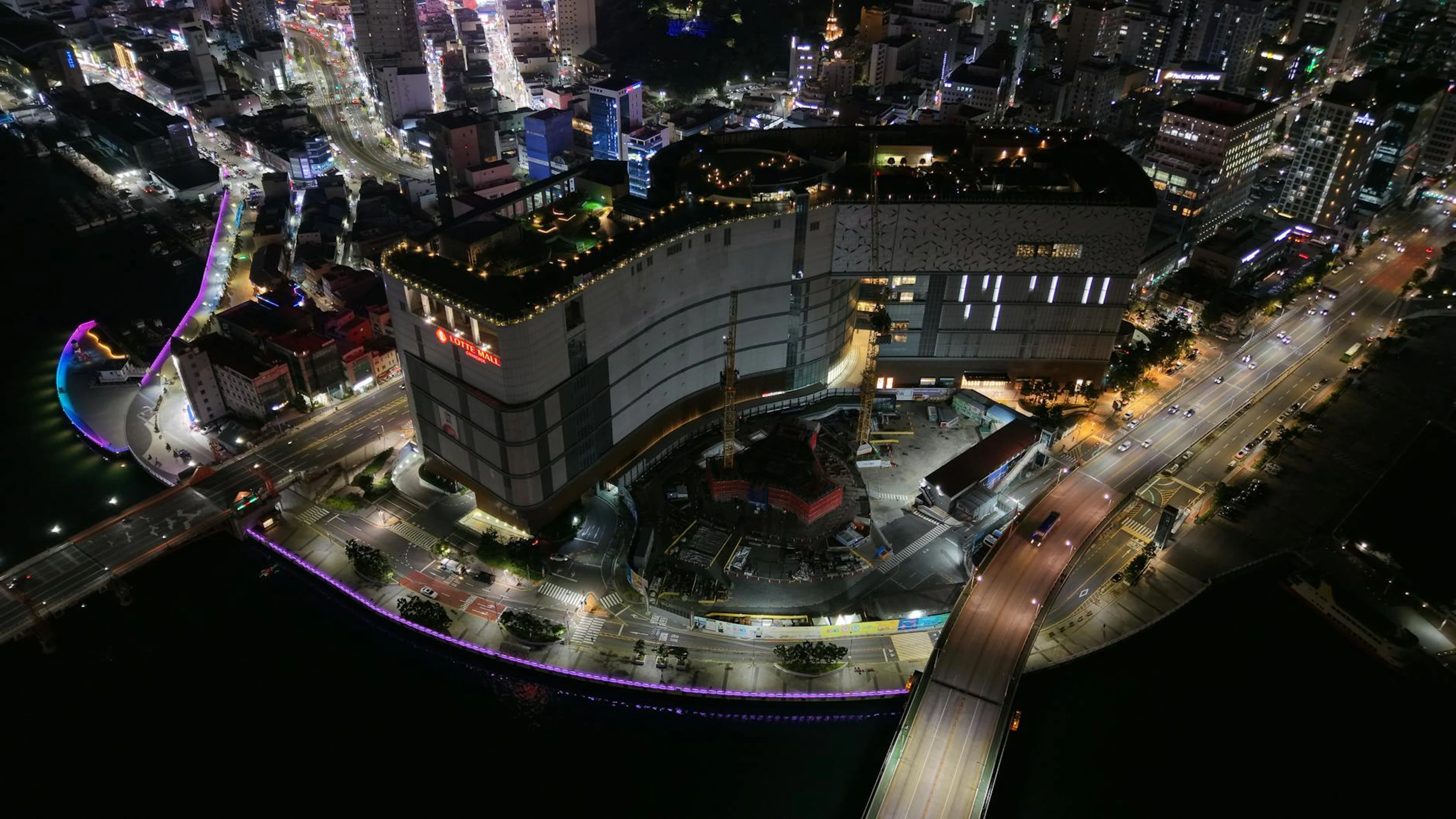 Aerial night view of Busan city showcasing vibrant lights and architecture.