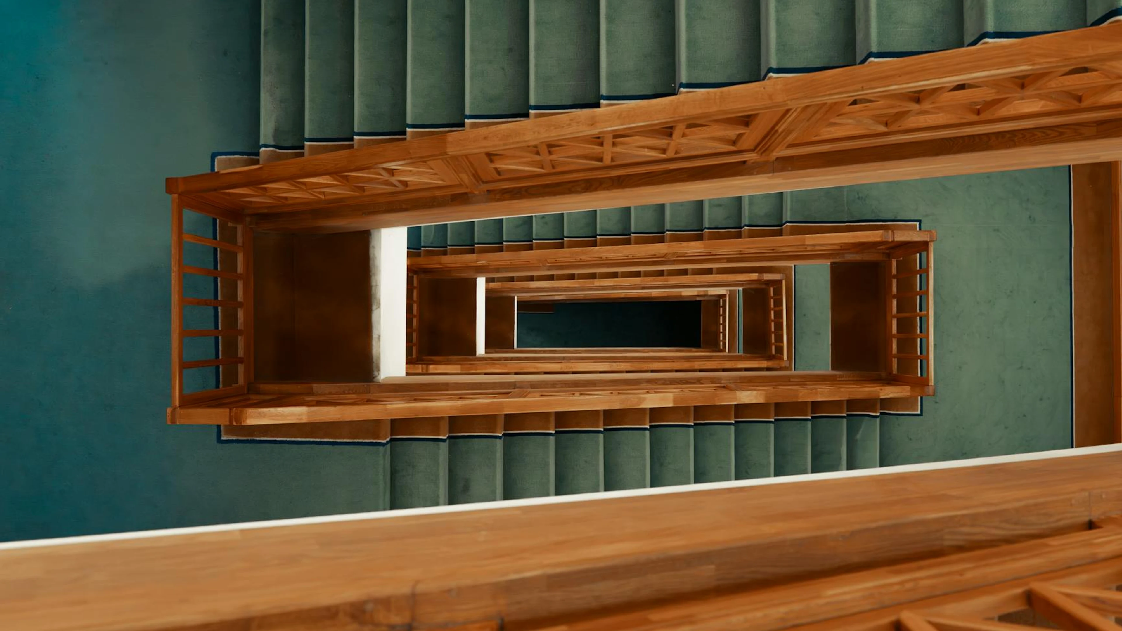 Aerial perspective of an indoor spiral staircase with wooden railings and green