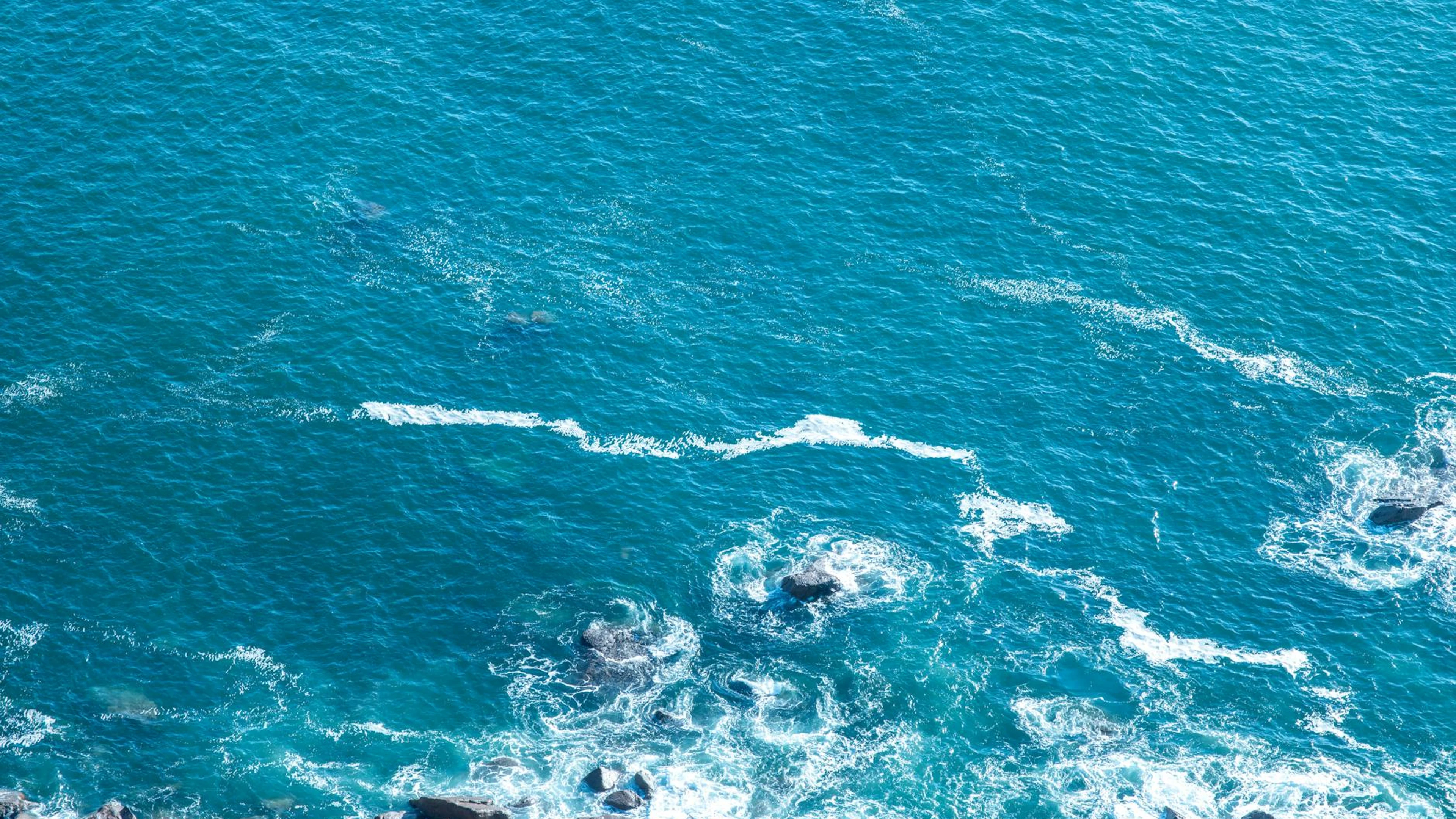 Get this stunning Aerial shot of clear blue ocean with waves crashing onto rocks along the coast. wallpaper in 4K Ultra HD quality. 3840x2160 ocean wallpaper available for free download.