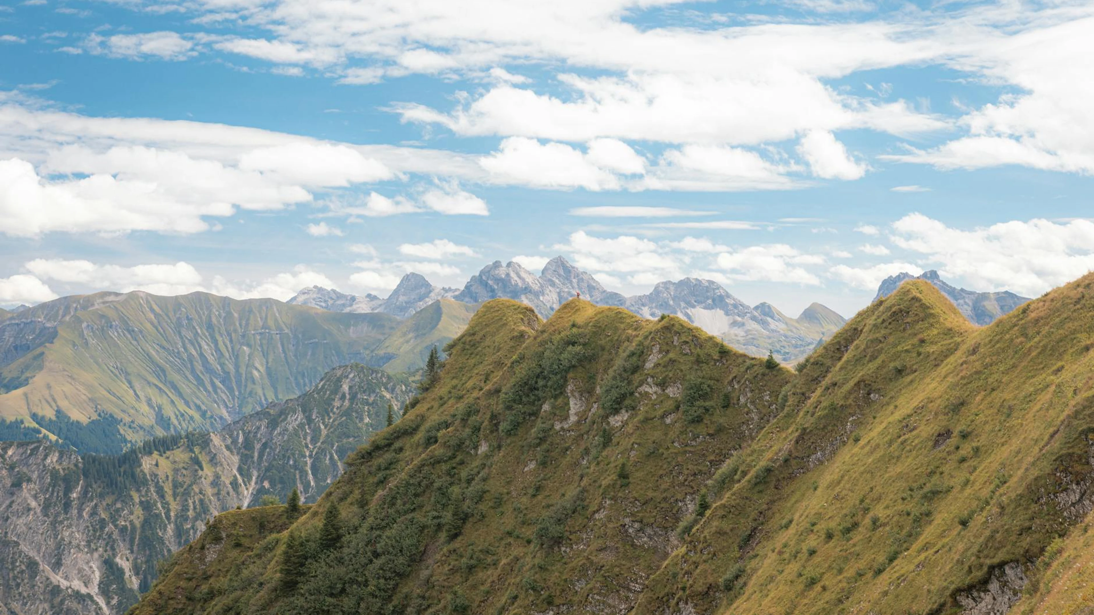 Download Aerial view of lush green mountains under a bright blue sky with clouds. wallpaper for free. 3840x2160 4K Ultra HD resolution, perfect for your desktop. High quality mountain wallpaper.