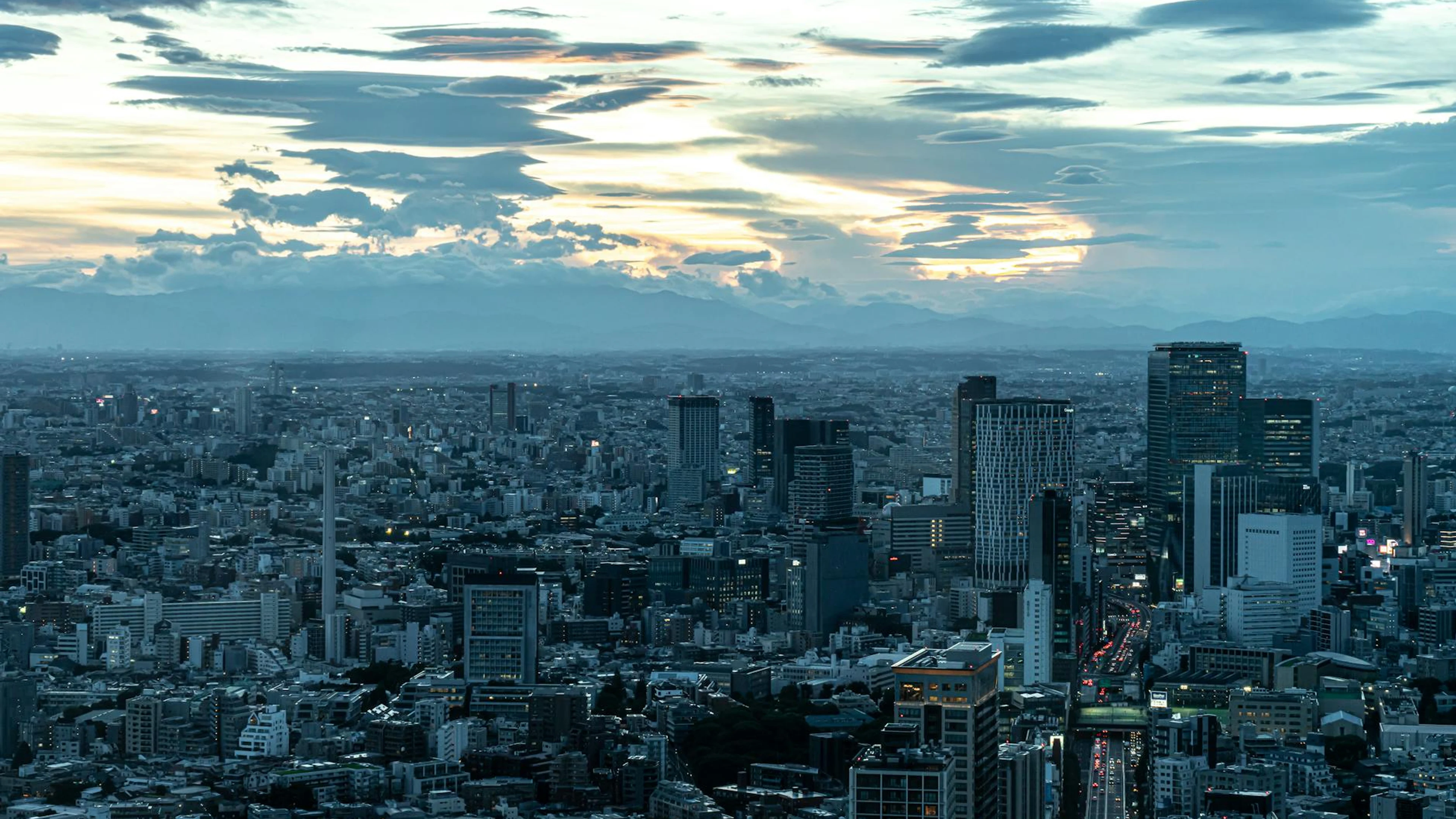 Free Aerial view of Minato City, Tokyo at dusk with dramatic cloud formations and cit wallpaper in 4K Ultra HD resolution (3840x2160). Beautiful city background for your screen. No signup required.