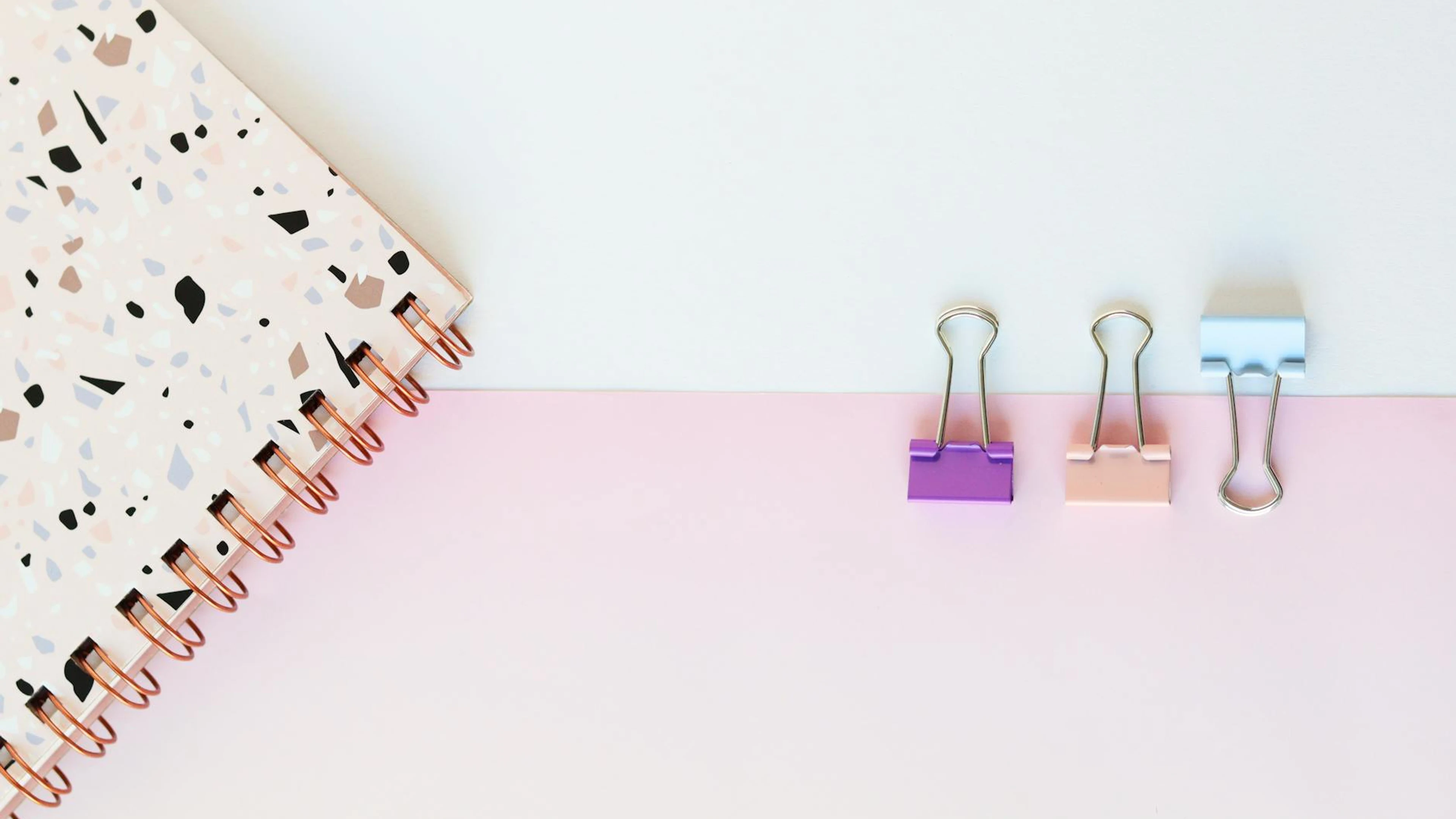 Get this stunning Aesthetic flat lay of pastel binder clips and terrazzo notebook. Ideal for offic wallpaper in 4K Ultra HD quality. 3840x2160 aesthetic wallpaper available for free download.