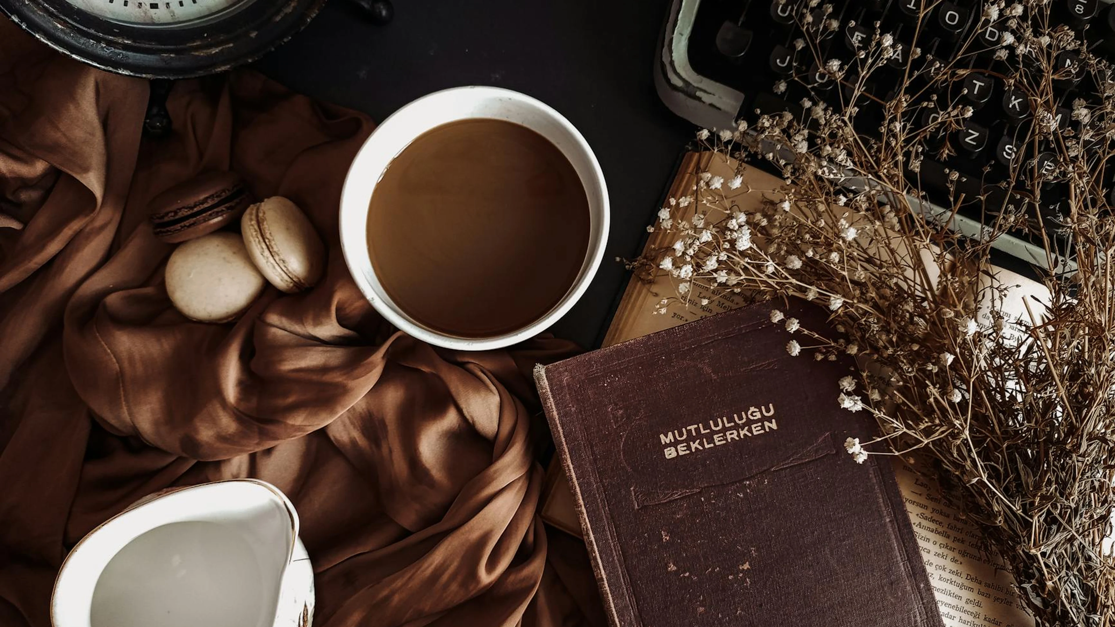 Download Aesthetic flat lay with coffee, book, typewriter, and rustic elements creating a wallpaper for free. 3840x2160 4K Ultra HD resolution, perfect for your desktop. High quality aesthetic wallpaper.