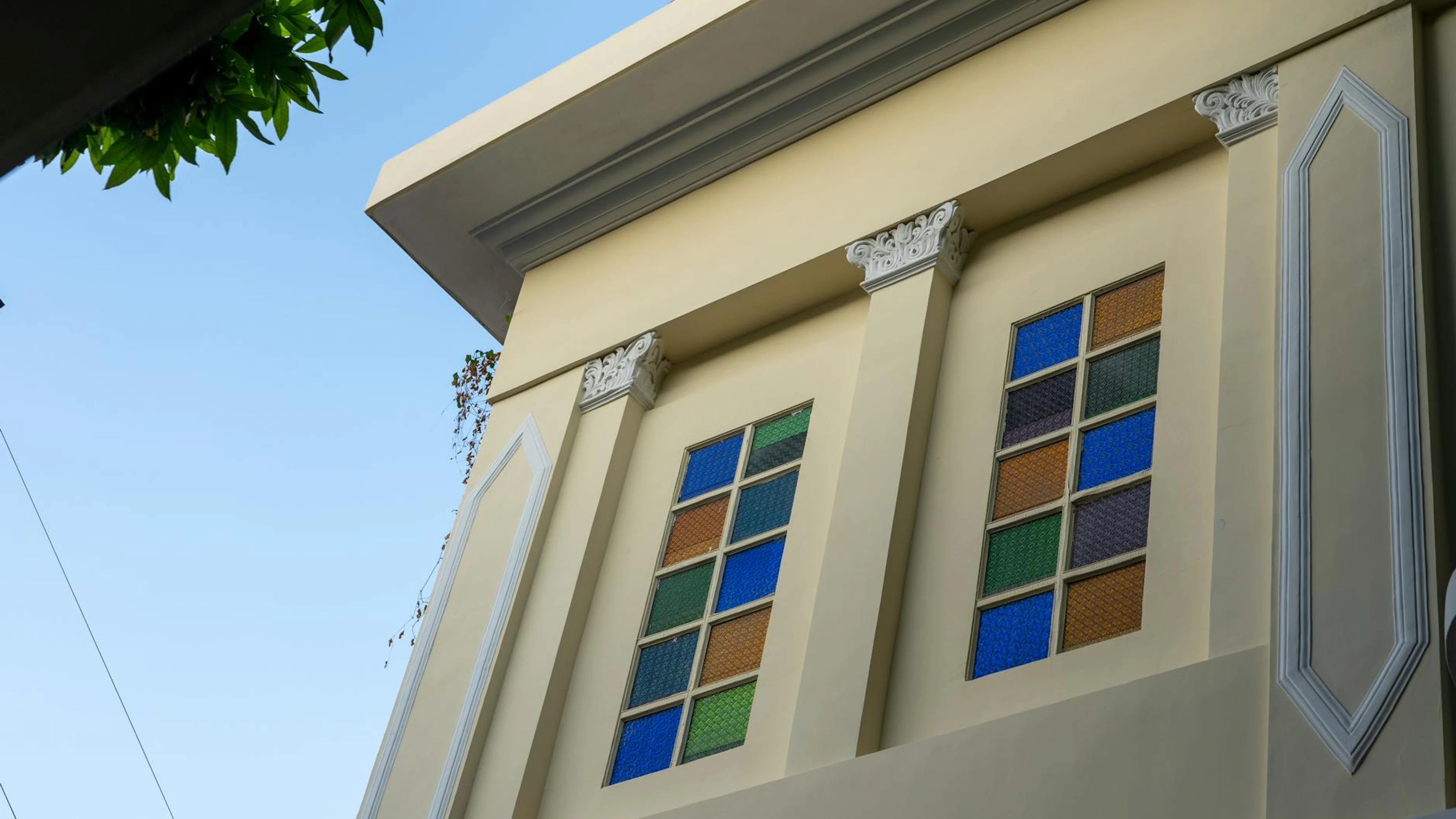 An elegant building facade with colorful stained glass windows, showcasing archi