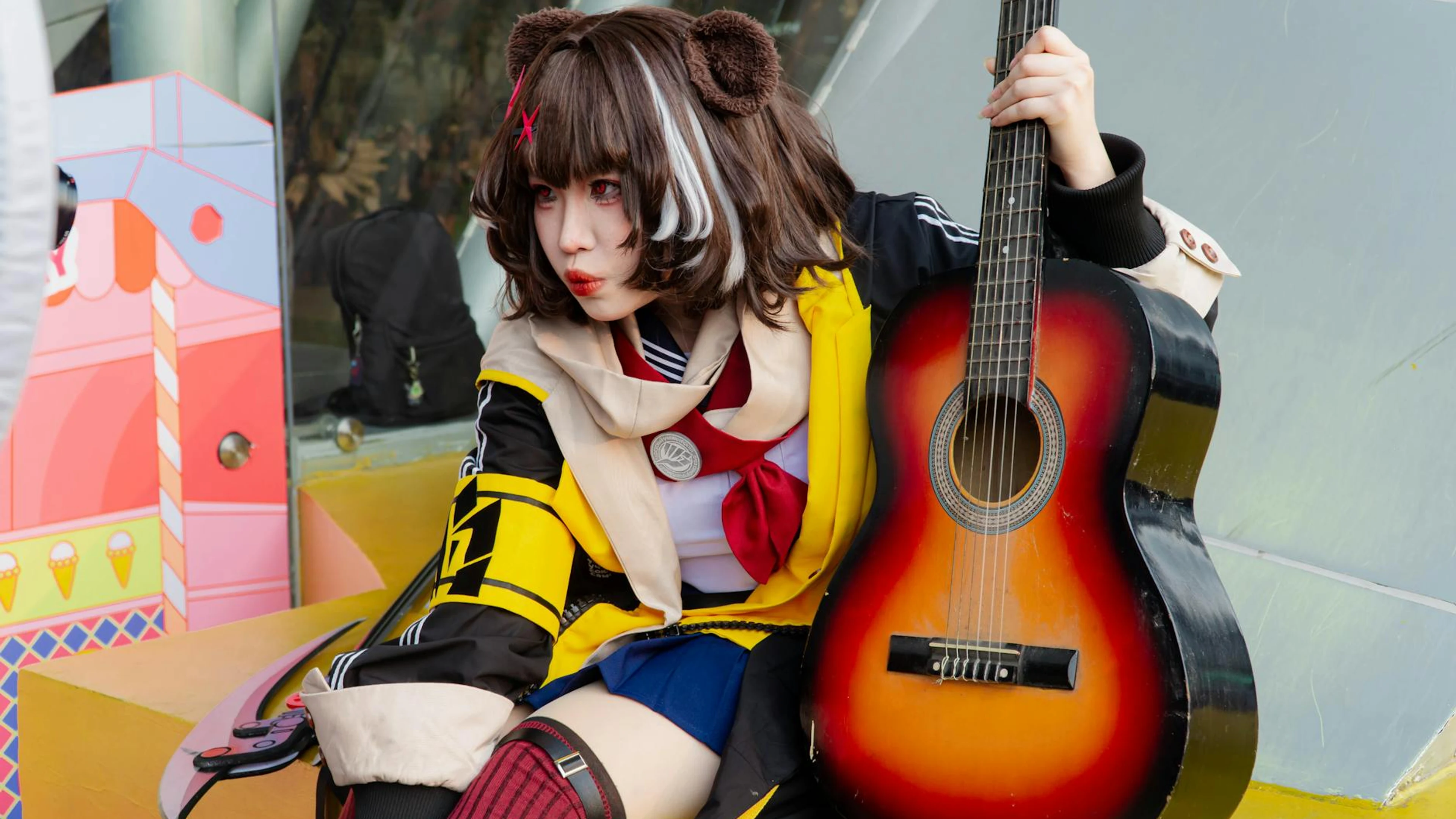Download Anime cosplayer with guitar in colorful costume outdoors, blending music and Jap wallpaper for free. 3840x2160 4K Ultra HD resolution, perfect for your desktop. High quality anime wallpaper.