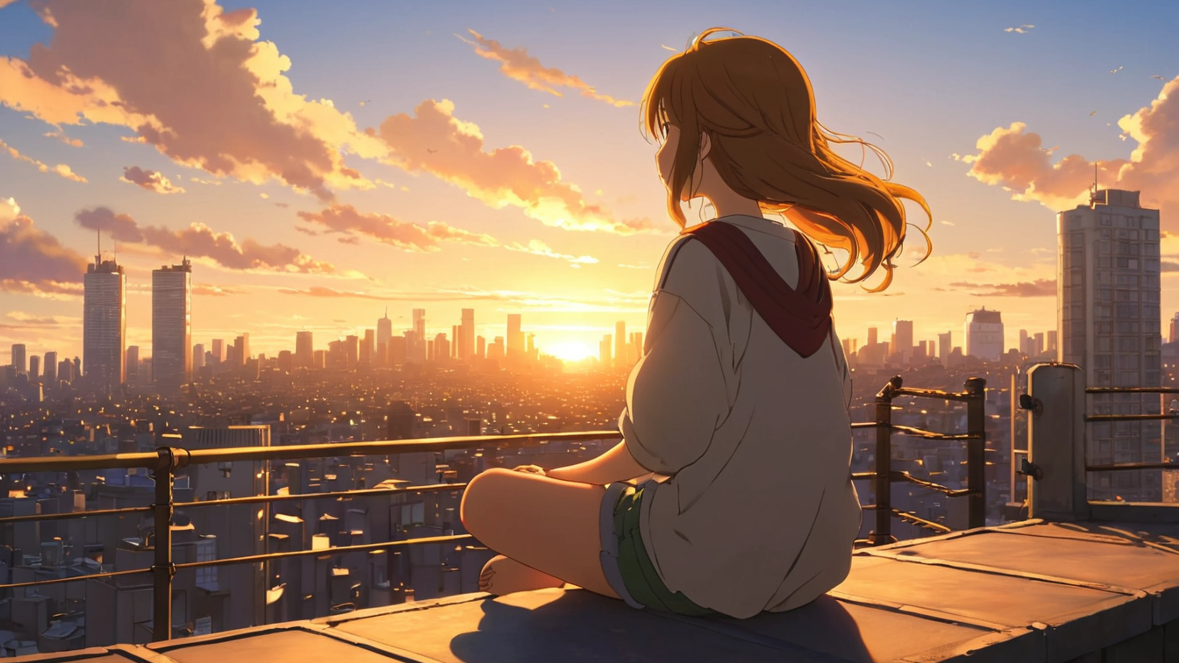Download Anime Girl Watching Sunset City wallpaper for free. 3840x2160 4K Ultra HD resolution, perfect for your desktop. High quality anime wallpaper.