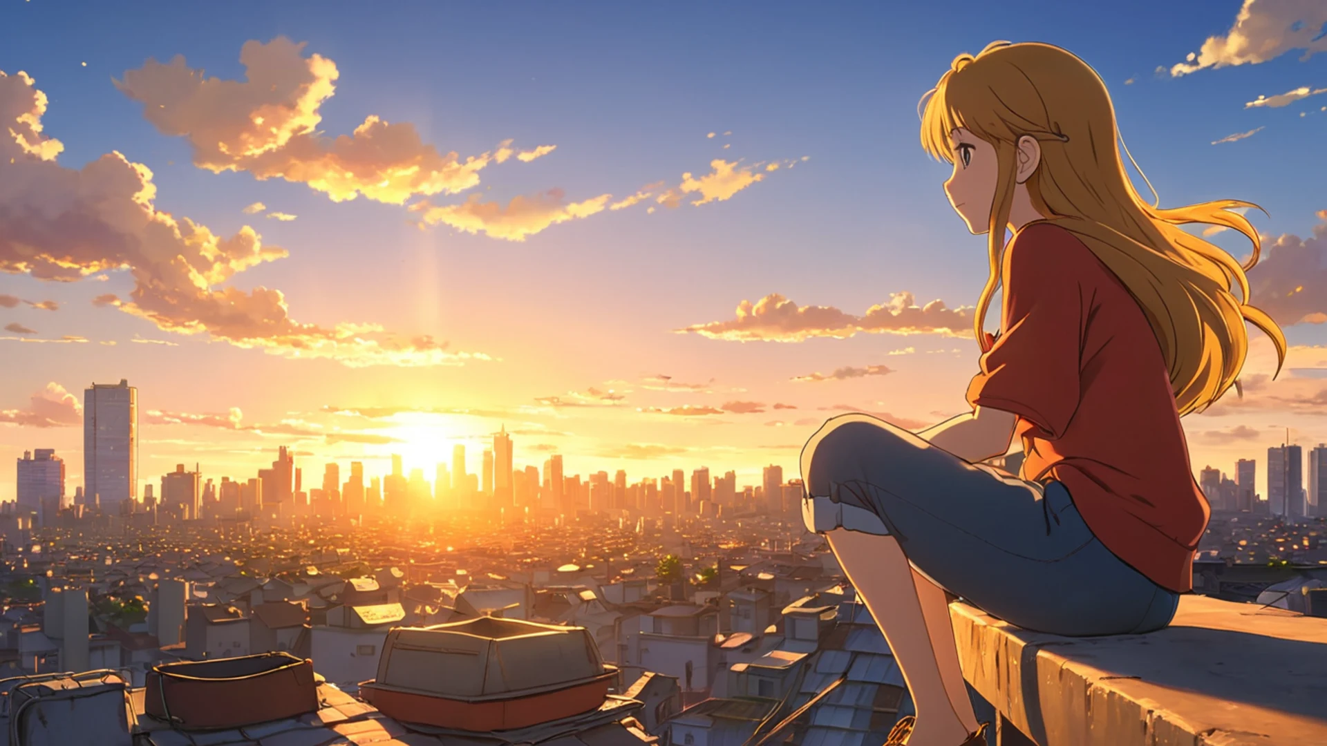Download Anime Girl Watching Sunset City wallpaper for free. 1920x1080 tablet resolution, perfect for your desktop. High quality anime wallpaper.
