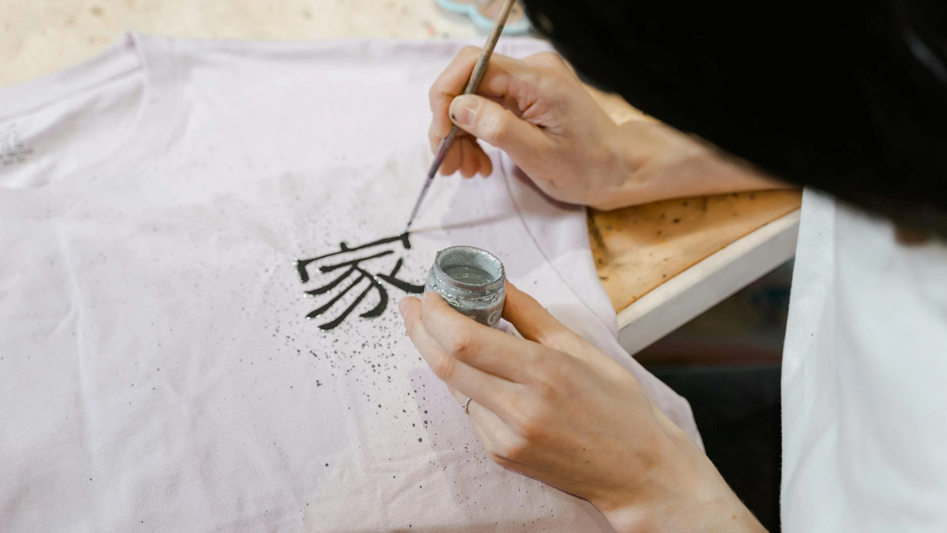 Artist hand painting calligraphy on a t-shirt, close-up view of creative process