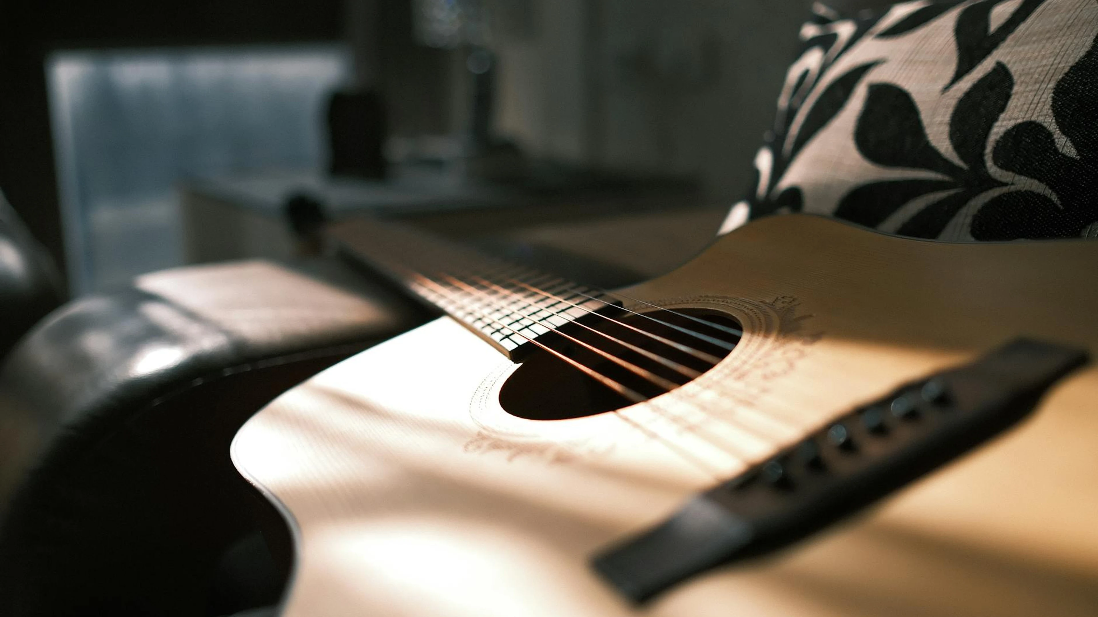 Artistic close-up shot of an acoustic guitar bathed in soft, warm light indoors.