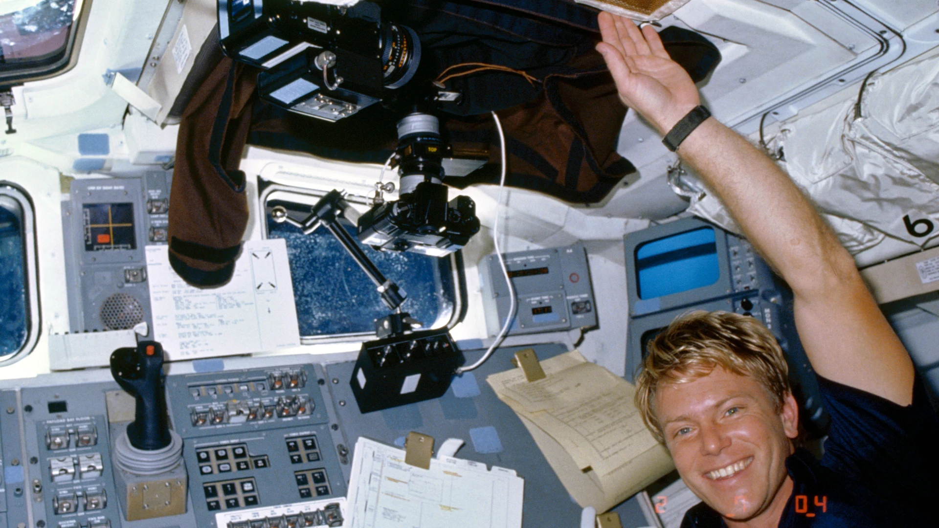 Astronaut George Nelson working on Comet Halley Active monitoring program