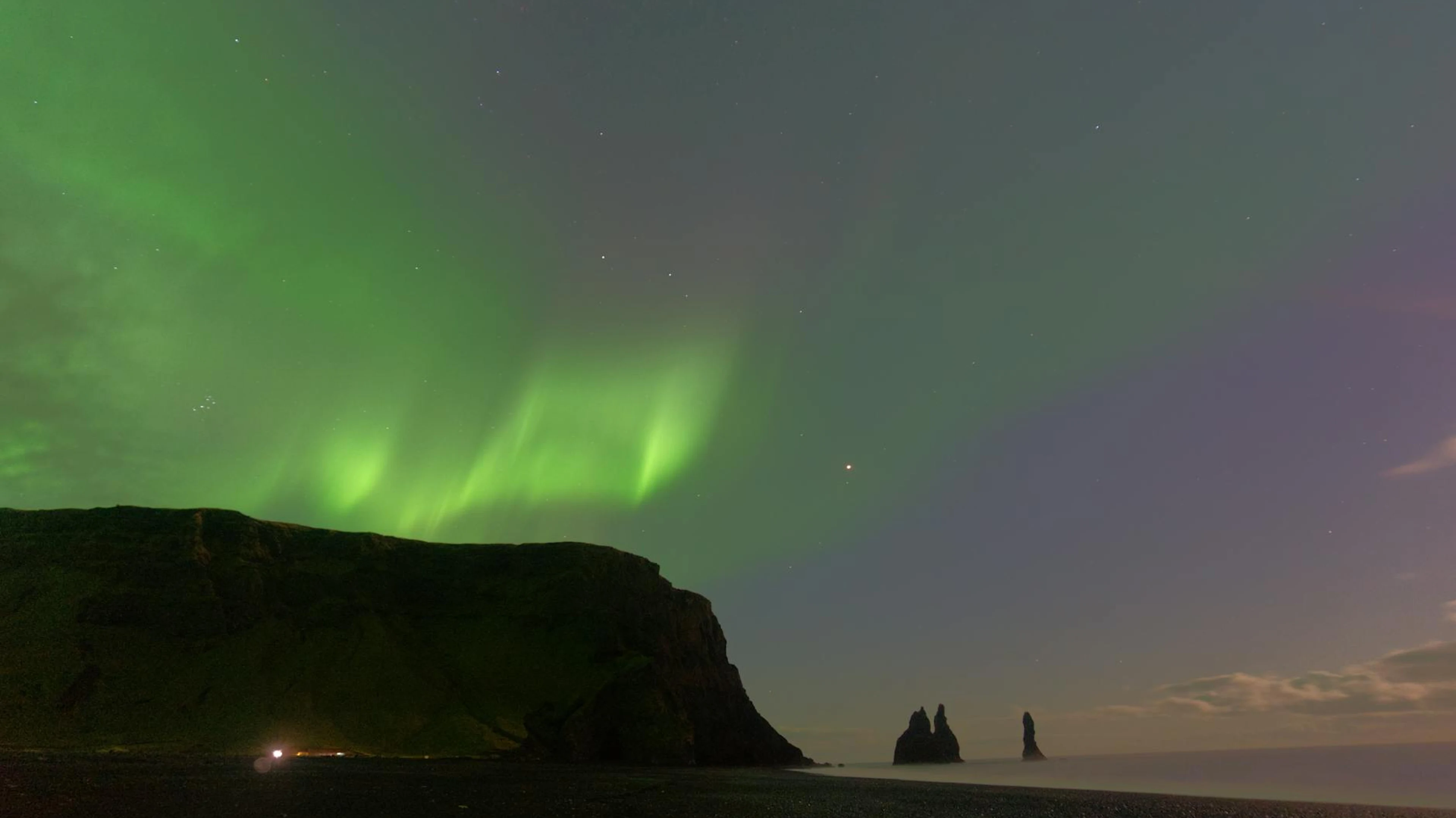 Get this stunning Aurora Borealis illuminating the night sky at Vík í Mýrdal with ocean views and wallpaper in 4K Ultra HD quality. 3840x2160 aurora wallpaper available for free download.