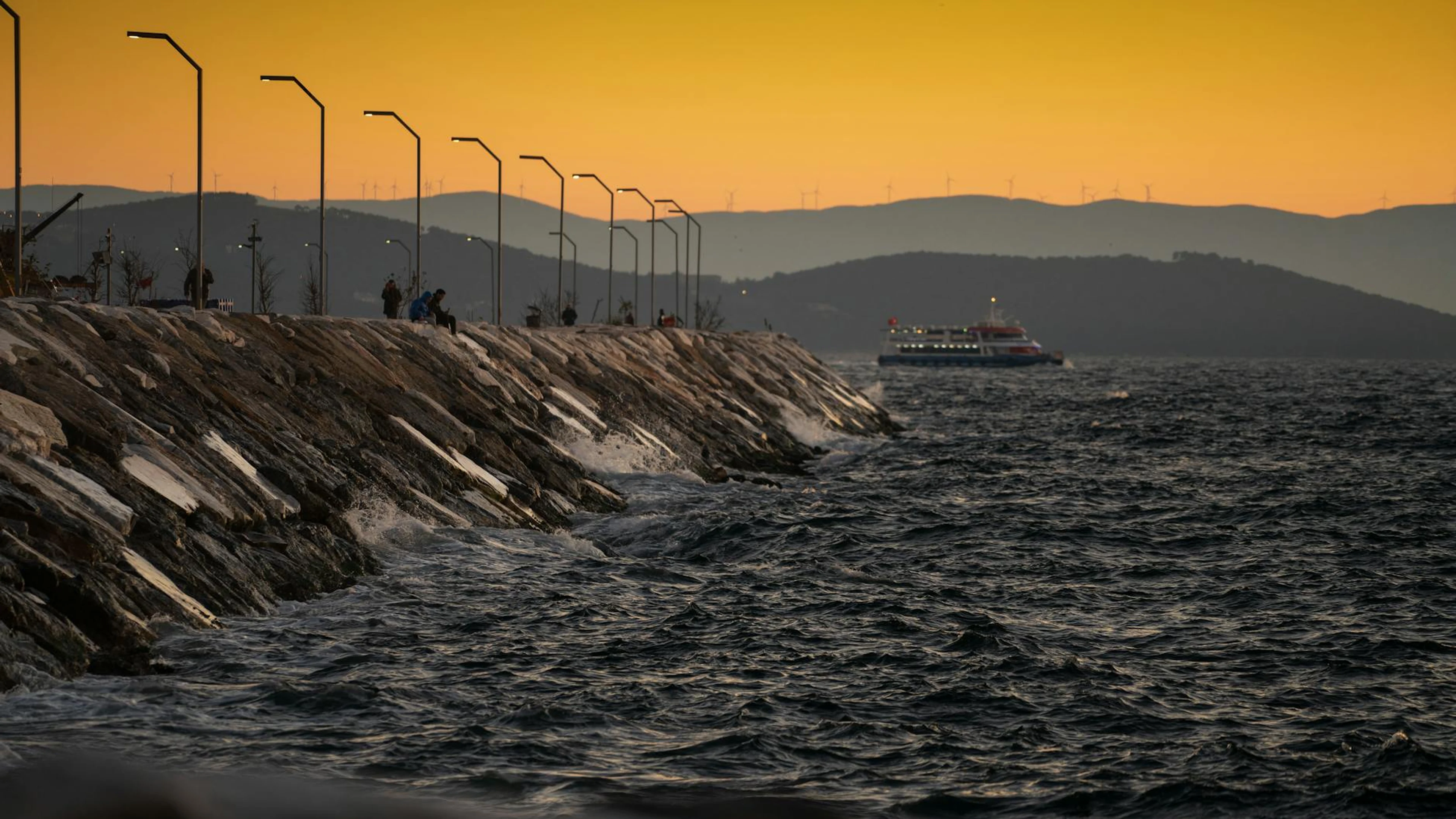 Beautiful sunset view along Istanbul's coast with silhouettes and a distant ferr