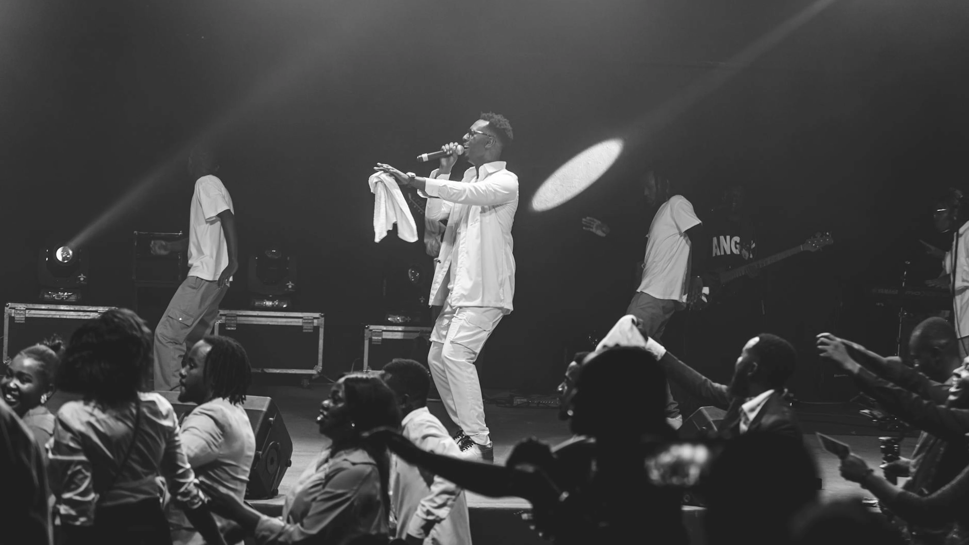 Black and white image capturing a dynamic live music performance on stage.