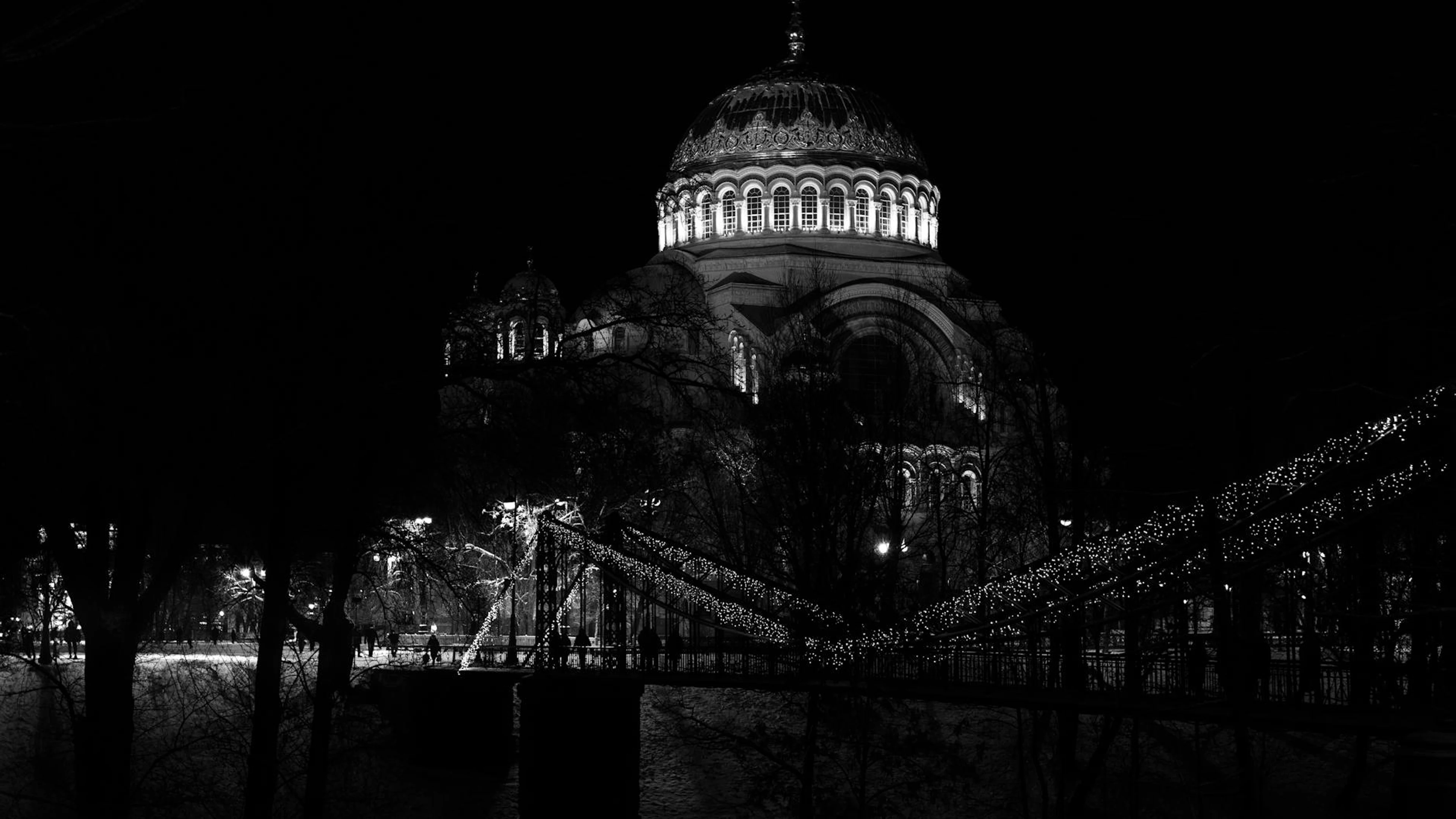 Get this stunning Black and white photo of an illuminated cathedral with a lit bridge at night. wallpaper in 4K Ultra HD quality. 3840x2160 dark wallpaper available for free download.