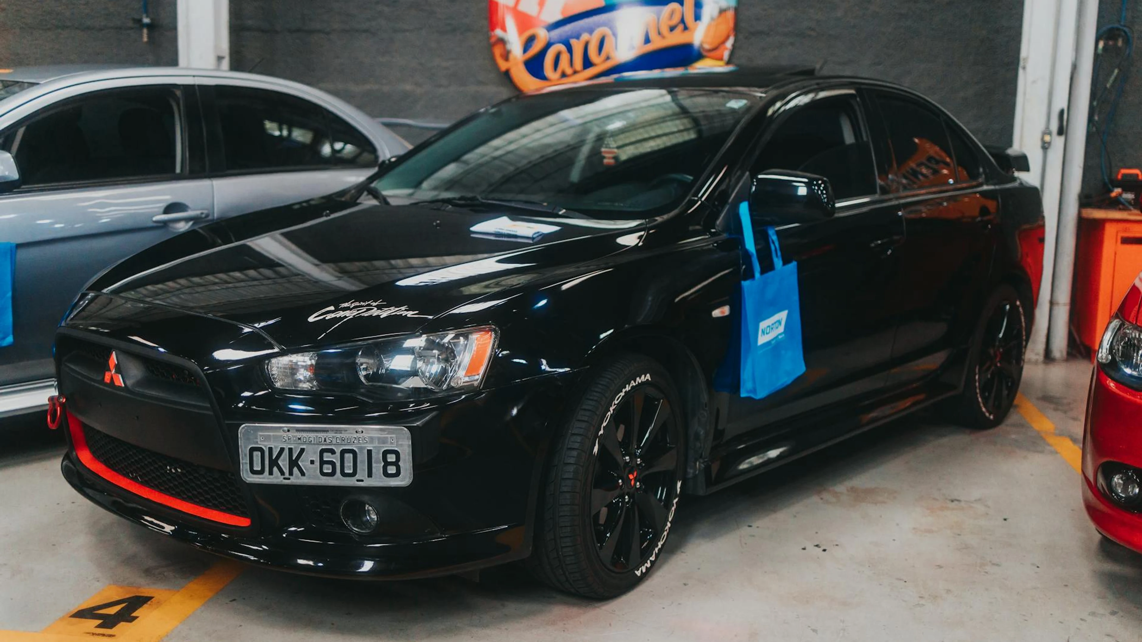 Black Mitsubishi Lancer parked in an indoor garage. Ideal for car enthusiasts an