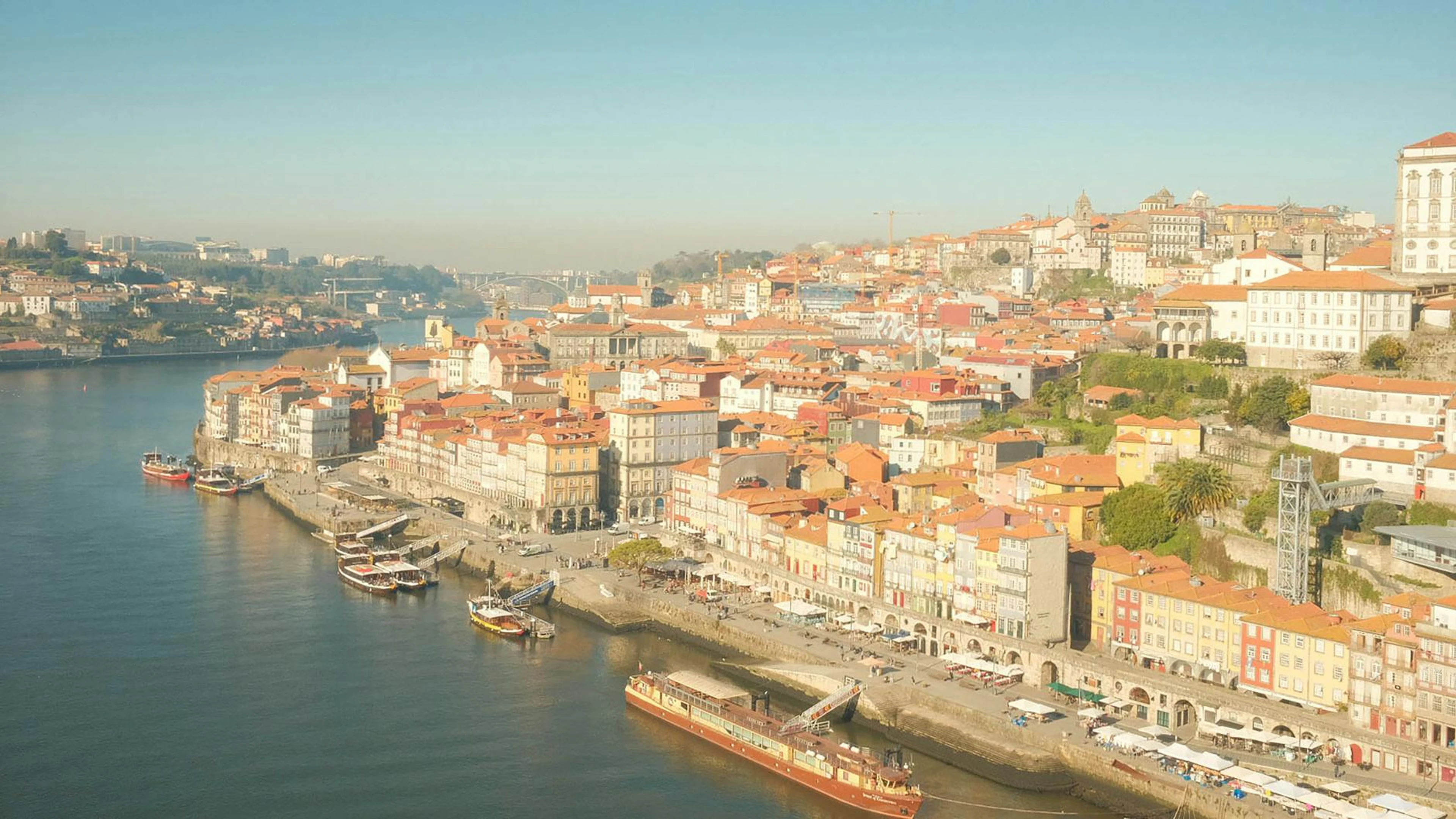 Free Breathtaking aerial view of Ribeira district along Douro River in Porto, Portuga wallpaper in 4K Ultra HD resolution (3840x2160). Beautiful city background for your screen. No signup required.