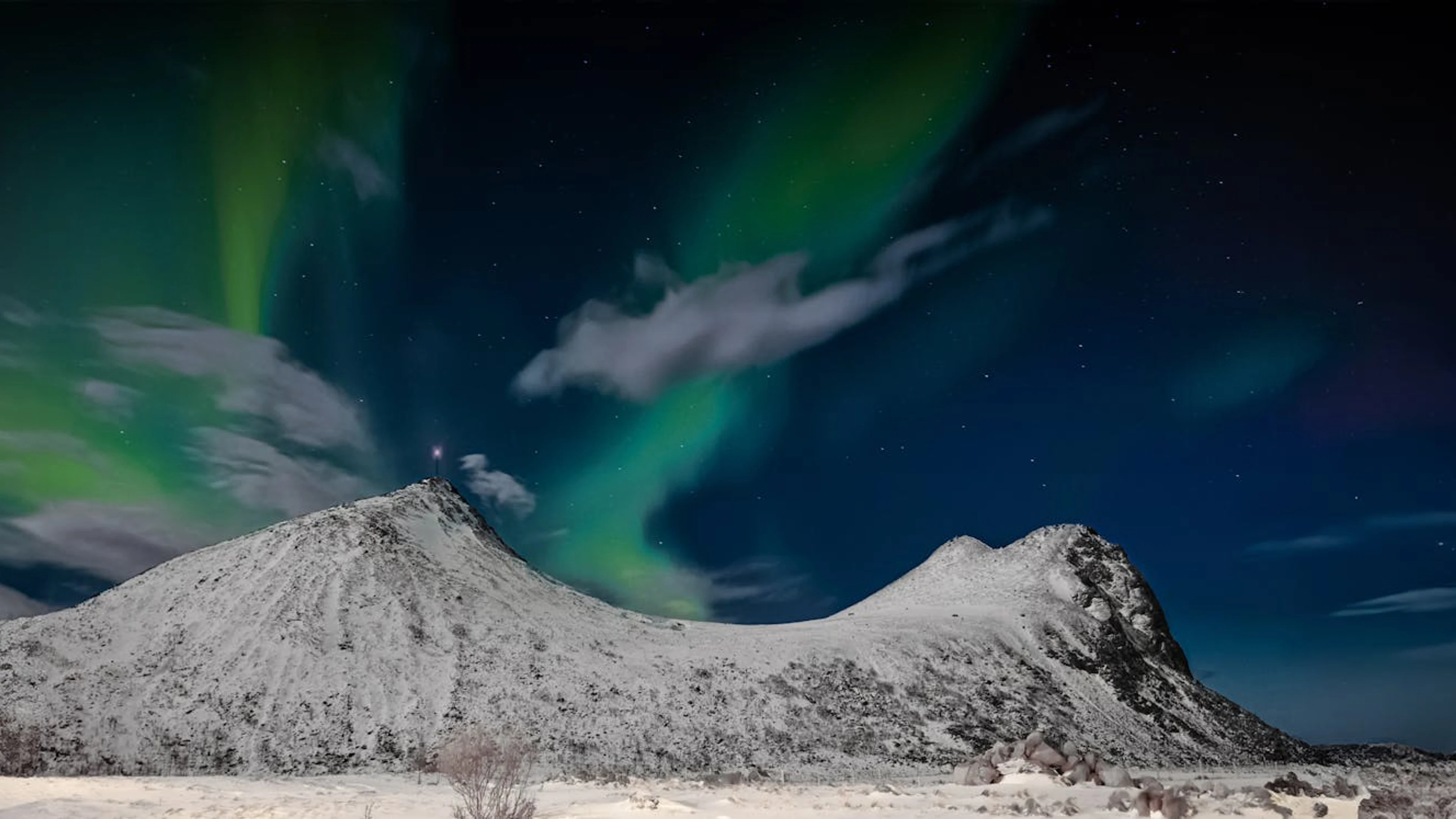 Breathtaking aurora borealis over snow-capped mountains in Myrland, Norway.