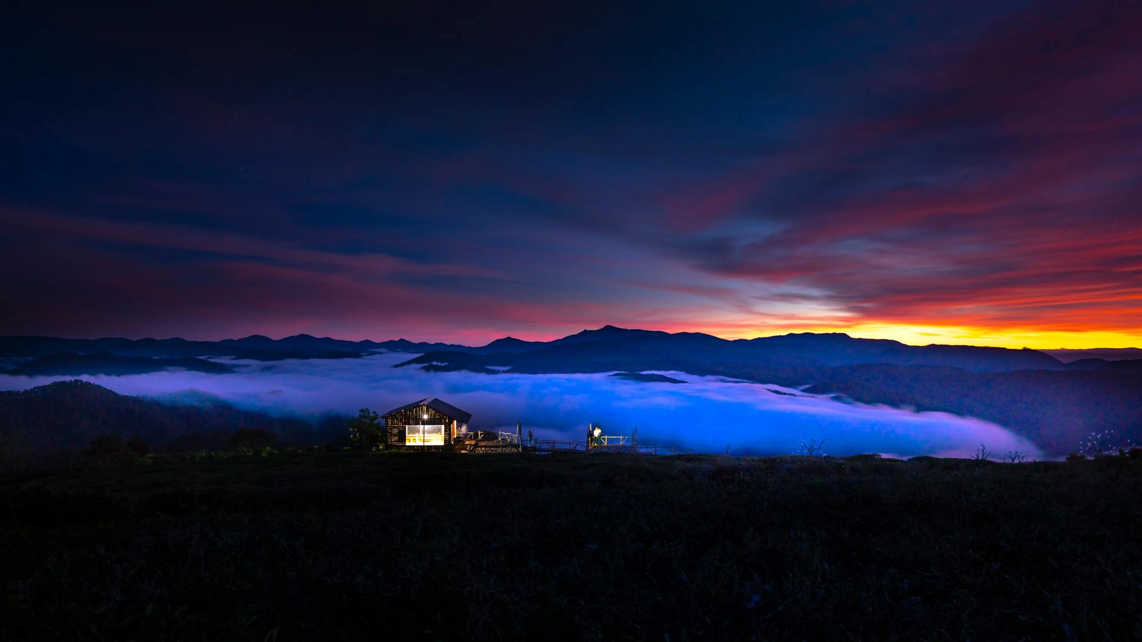 Free Breathtaking sunset over a mountain range with a cozy illuminated cabin and vibr wallpaper in 4K Ultra HD resolution (3840x2160). Beautiful mountain background for your screen. No signup required.