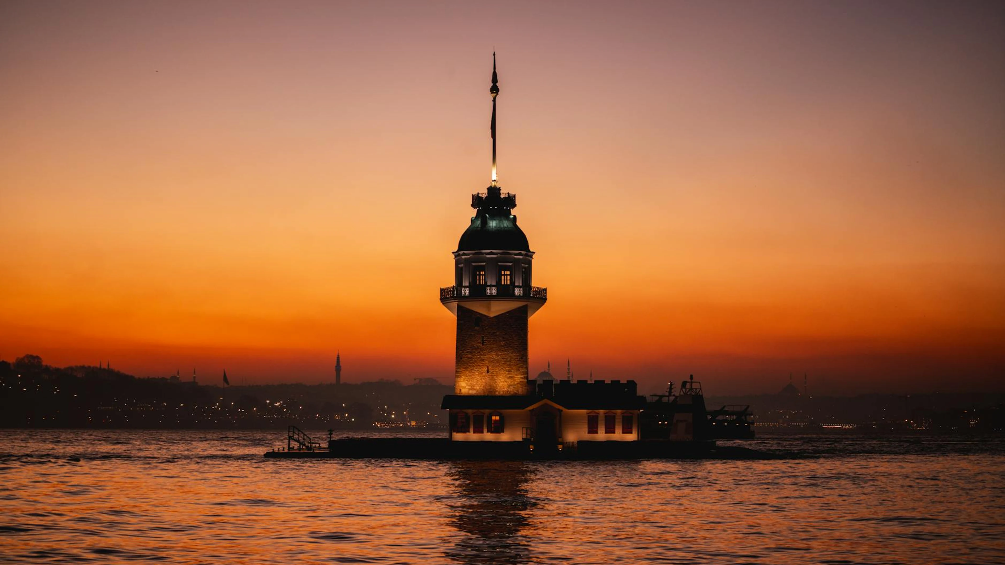 Get this stunning Breathtaking view of Maiden's Tower silhouetted against a vibrant sunset over İs wallpaper in 4K Ultra HD quality. 3840x2160 sunset wallpaper available for free download.
