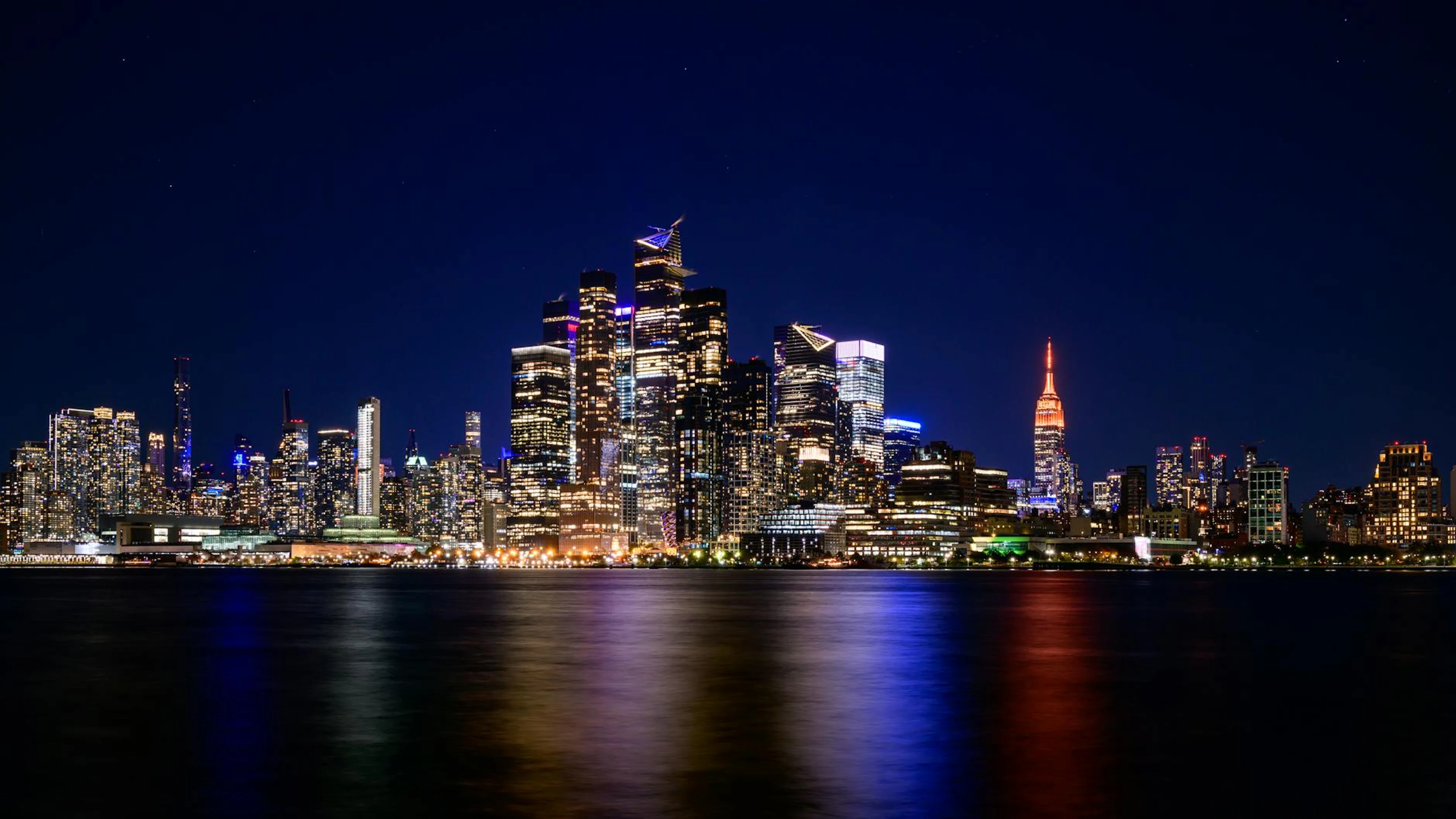 Get this stunning Breathtaking view of New York City skyline with vibrant city lights reflecting o wallpaper in 4K Ultra HD quality. 3840x2160 city wallpaper available for free download.