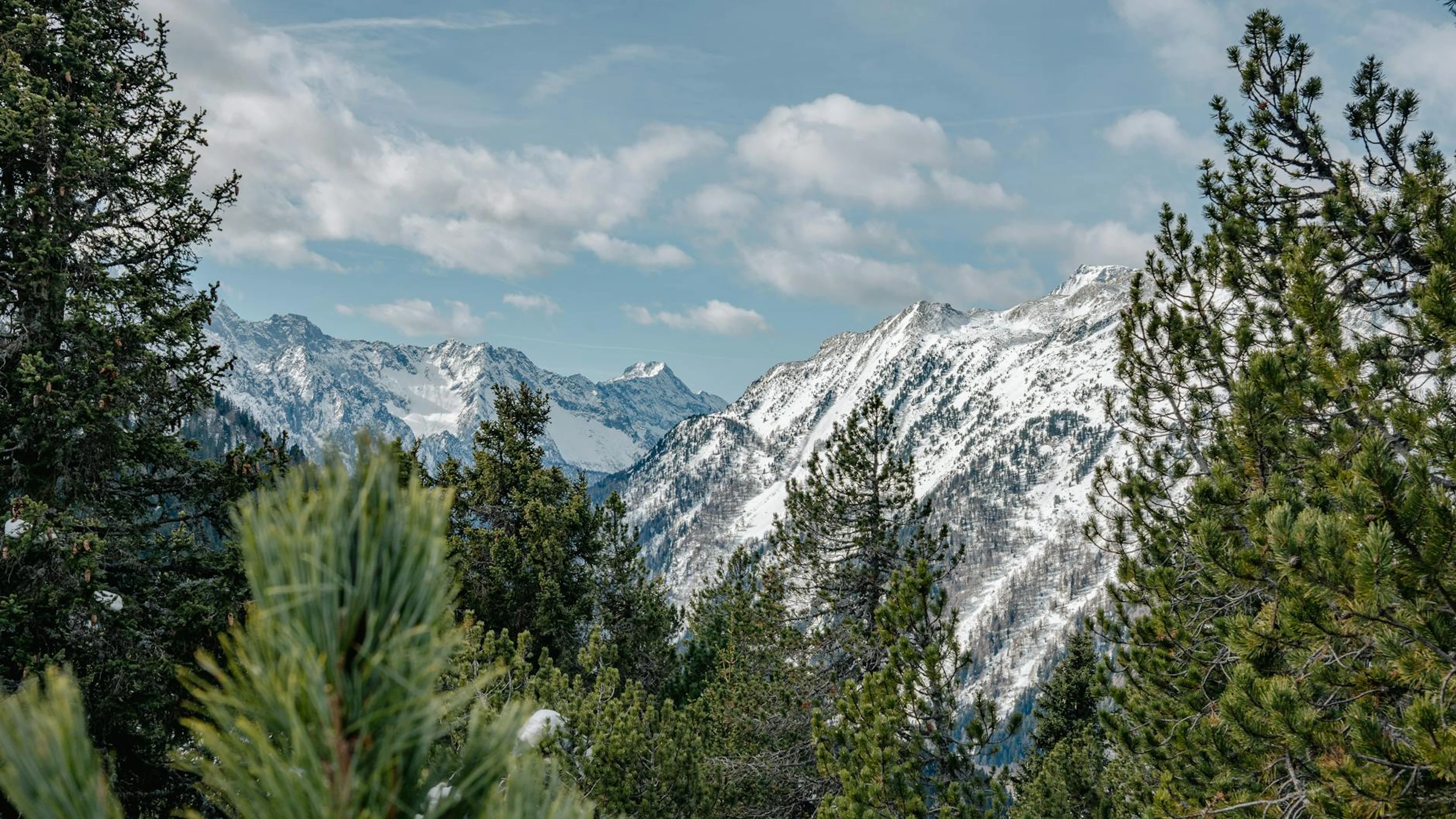 Get this stunning Breathtaking view of snow-capped mountains framed by evergreen trees, ideal for wallpaper in 4K Ultra HD quality. 3840x2160 mountain wallpaper available for free download.