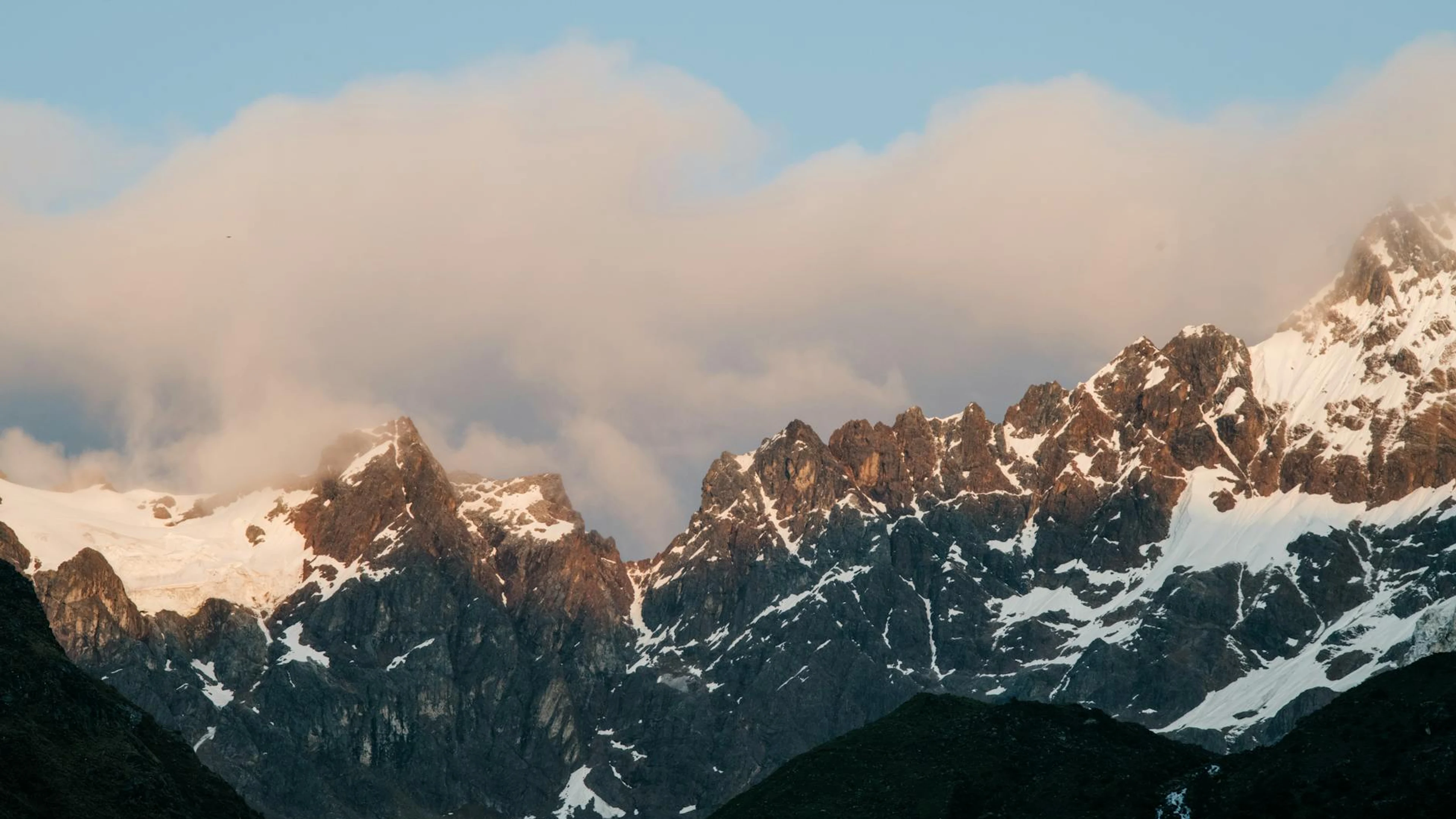 Free Breathtaking view of snow-capped mountains under a cloudy sunset in Peru. wallpaper in 4K Ultra HD resolution (3840x2160). Beautiful mountain background for your screen. No signup required.