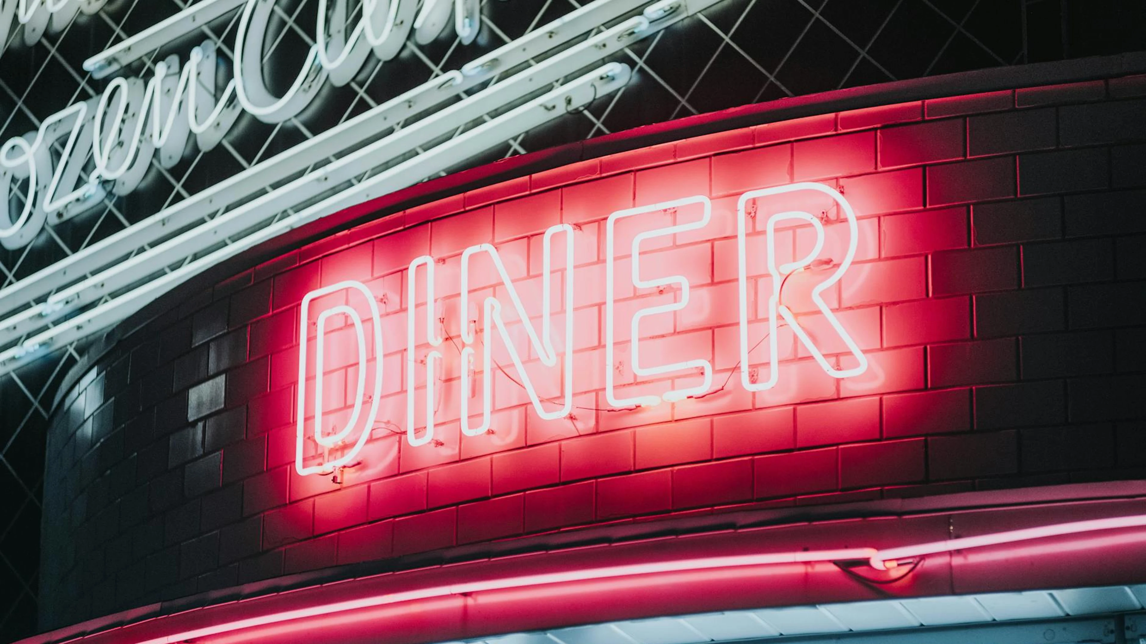 Bright neon diner sign glowing against dark tiled wall, evoking a vintage retro