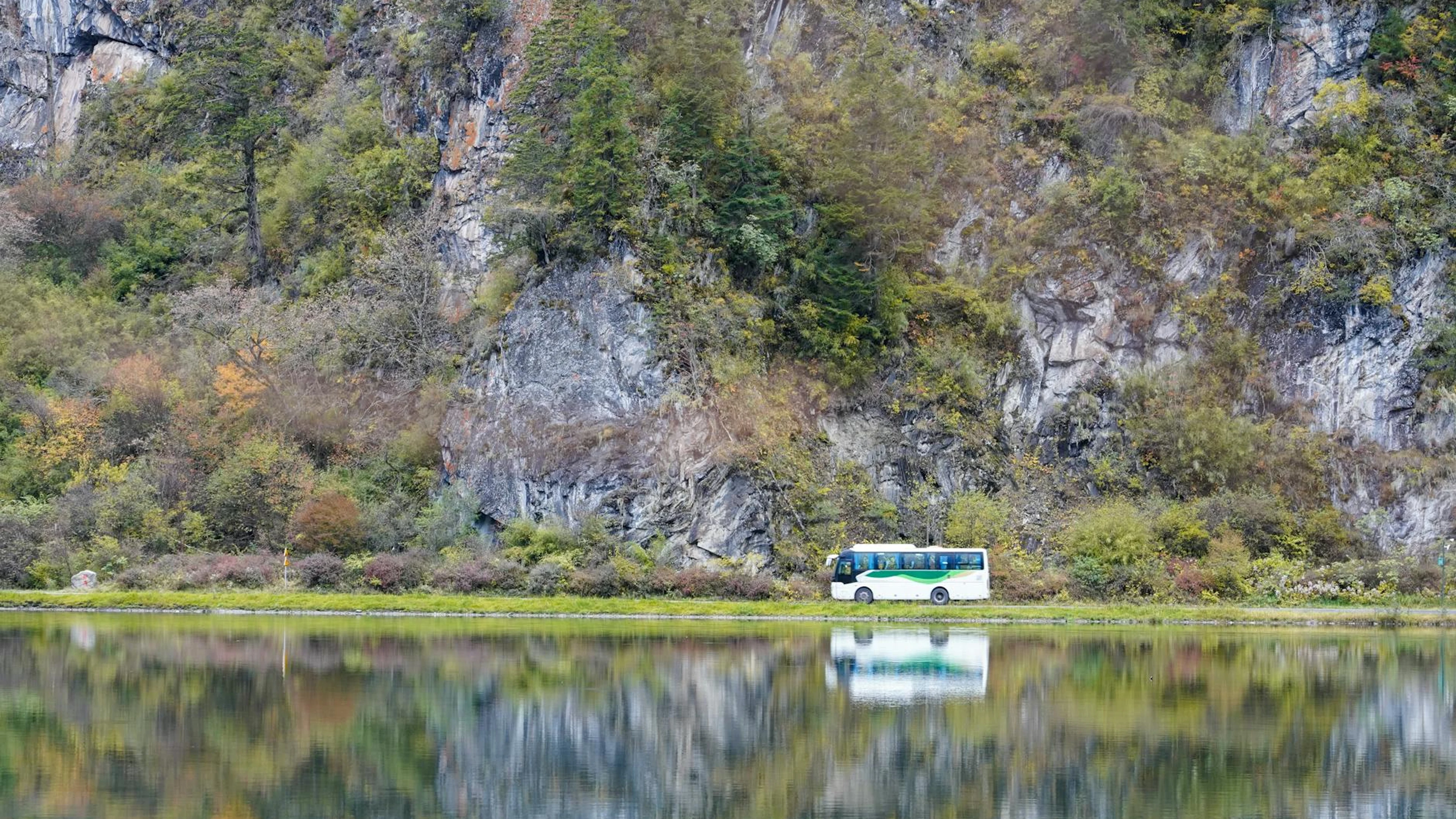 Bus traveling along a tranquil lake reflecting mountain cliffs and lush greenery