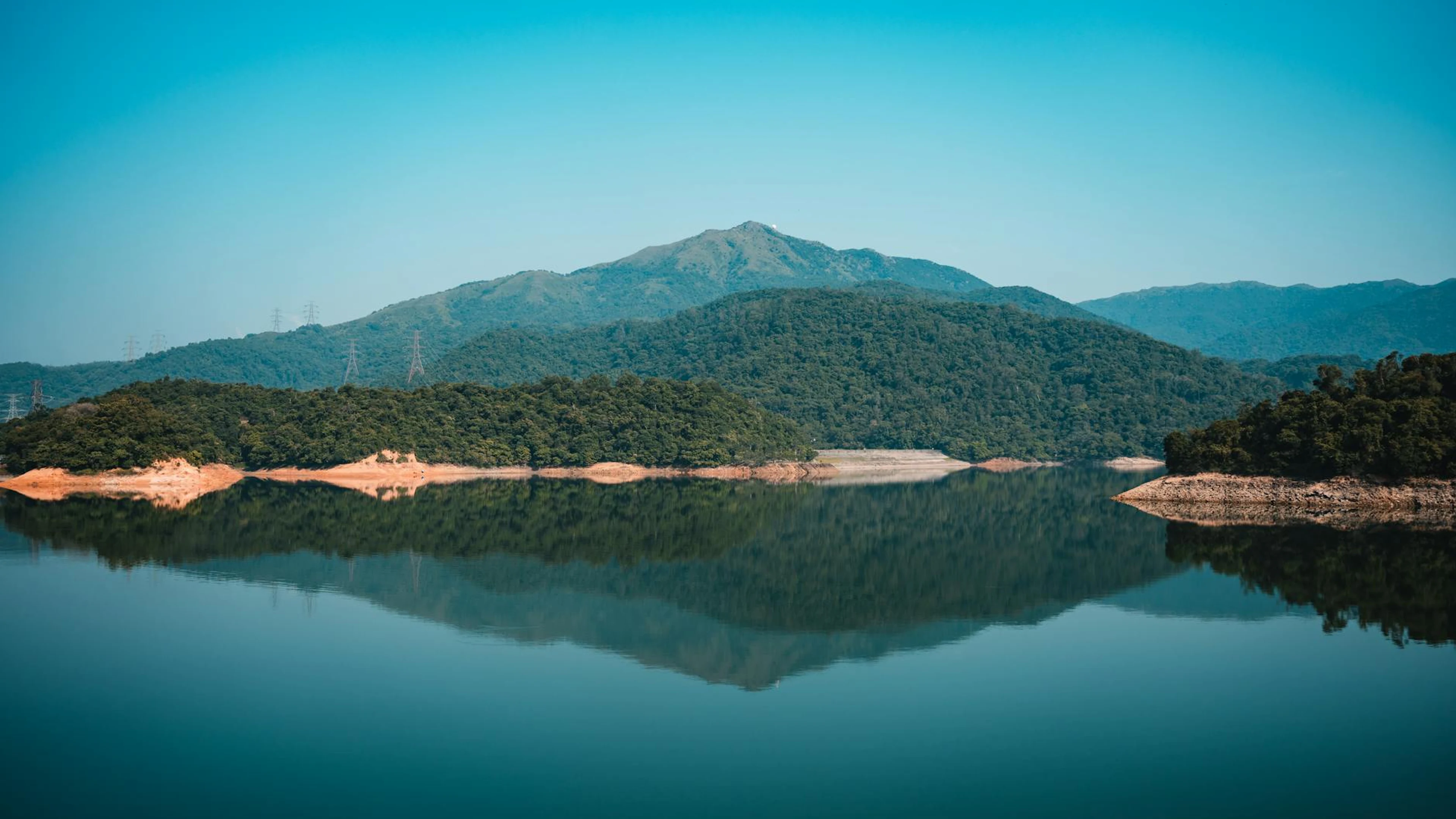 Free Calm lake with mountains and green forests reflected under a blue sky in serene wallpaper in 4K Ultra HD resolution (3840x2160). Beautiful lake background for your screen. No signup required.