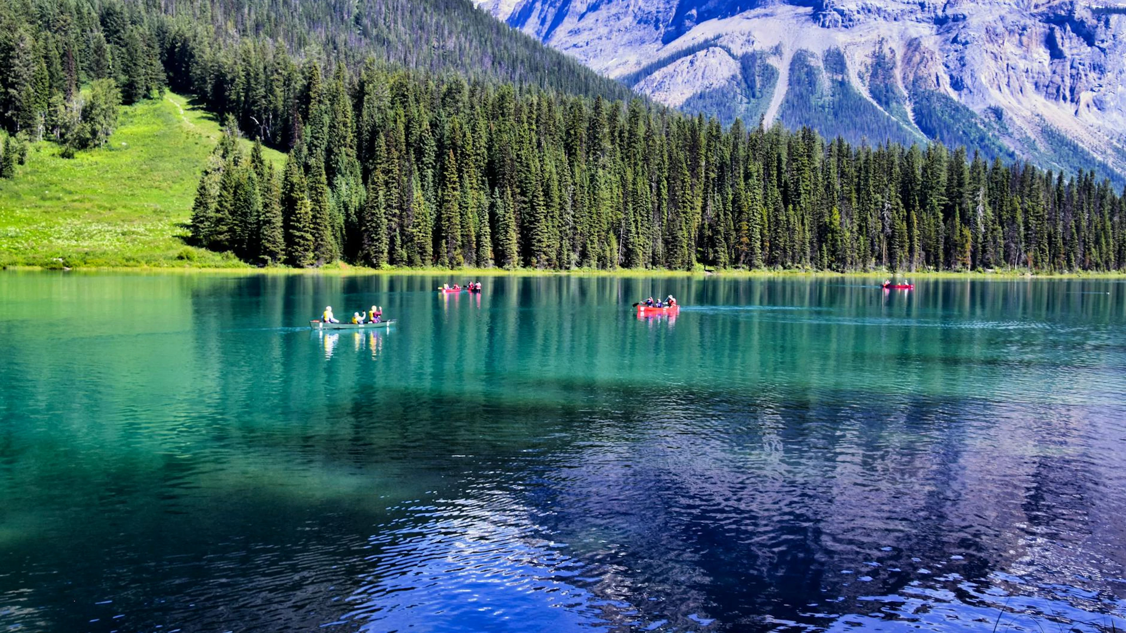 Download Canoes glide on the serene waters of Emerald Lake in British Columbia, surrounde wallpaper for free. 3840x2160 4K Ultra HD resolution, perfect for your desktop. High quality lake wallpaper.