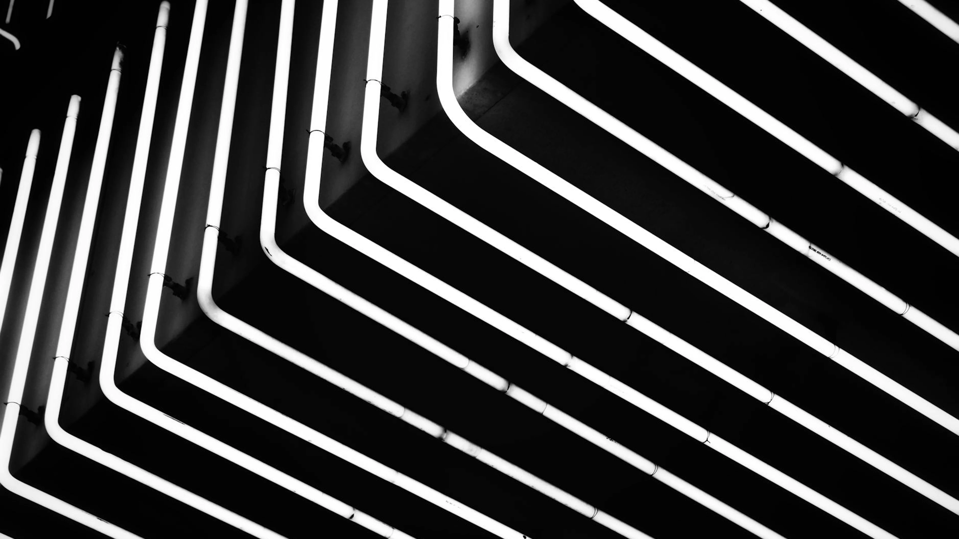 Get this stunning Captivating geometric neon patterns in black and white, perfect for modern urban wallpaper in 4K Ultra HD quality. 3840x2160 dark wallpaper available for free download.