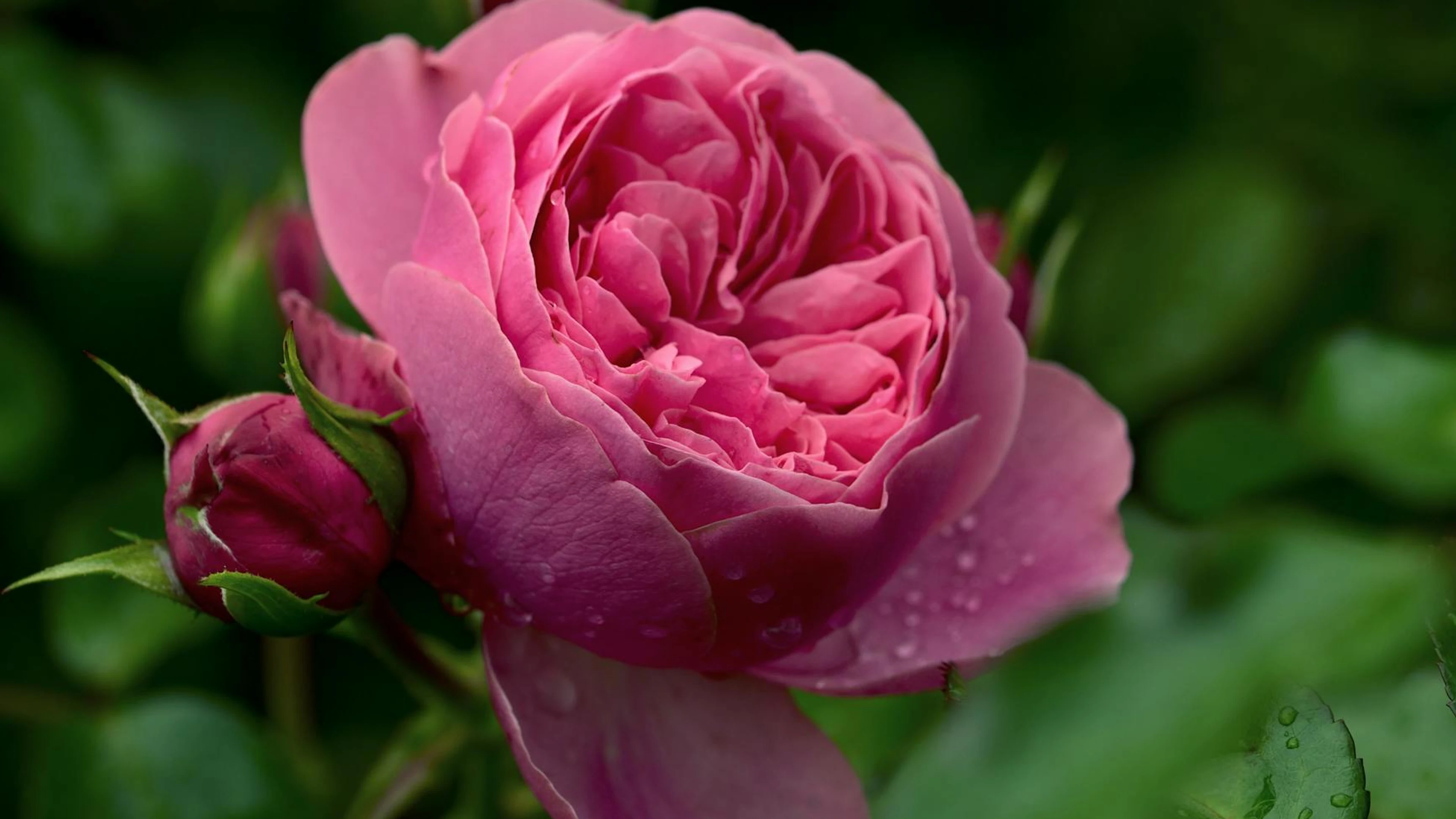 Free Captivating pink rose with dewdrops, lush green leaves, and budding blooms captu wallpaper in 4K Ultra HD resolution (3840x2160). Beautiful flowers background for your screen. No signup required.