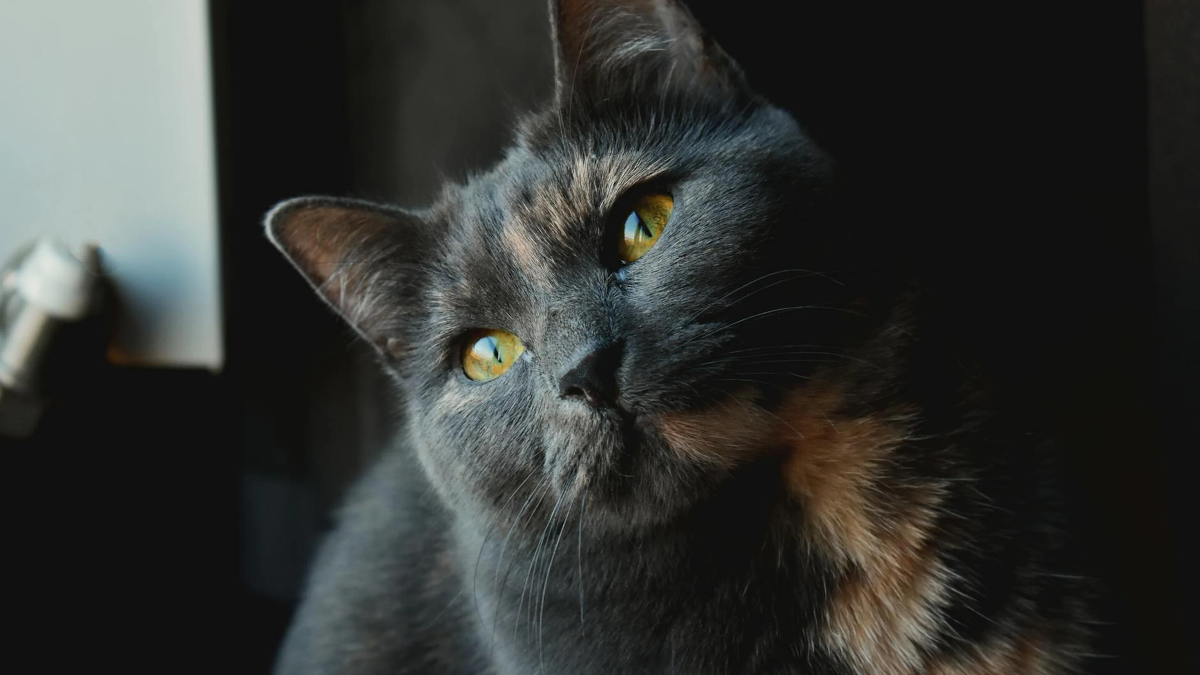 Download Captivating shot of a domestic grey cat with striking yellow eyes and a focused wallpaper for free. 3840x2160 4K Ultra HD resolution, perfect for your desktop. High quality animals wallpaper.