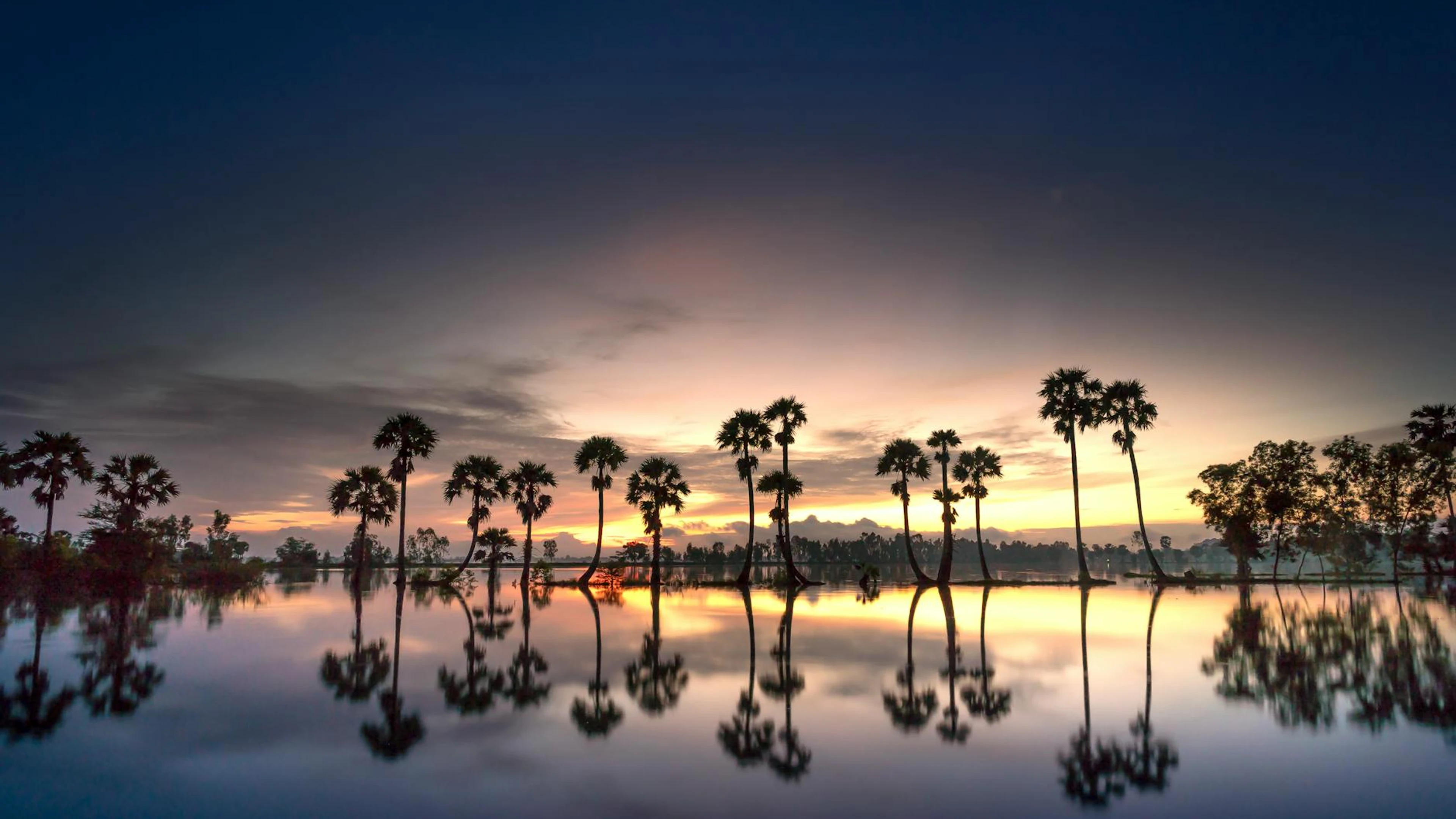 Get this stunning Captivating sunset reflection with silhouetted palm trees on a tranquil lake. wallpaper in 4K Ultra HD quality. 3840x2160 lake wallpaper available for free download.