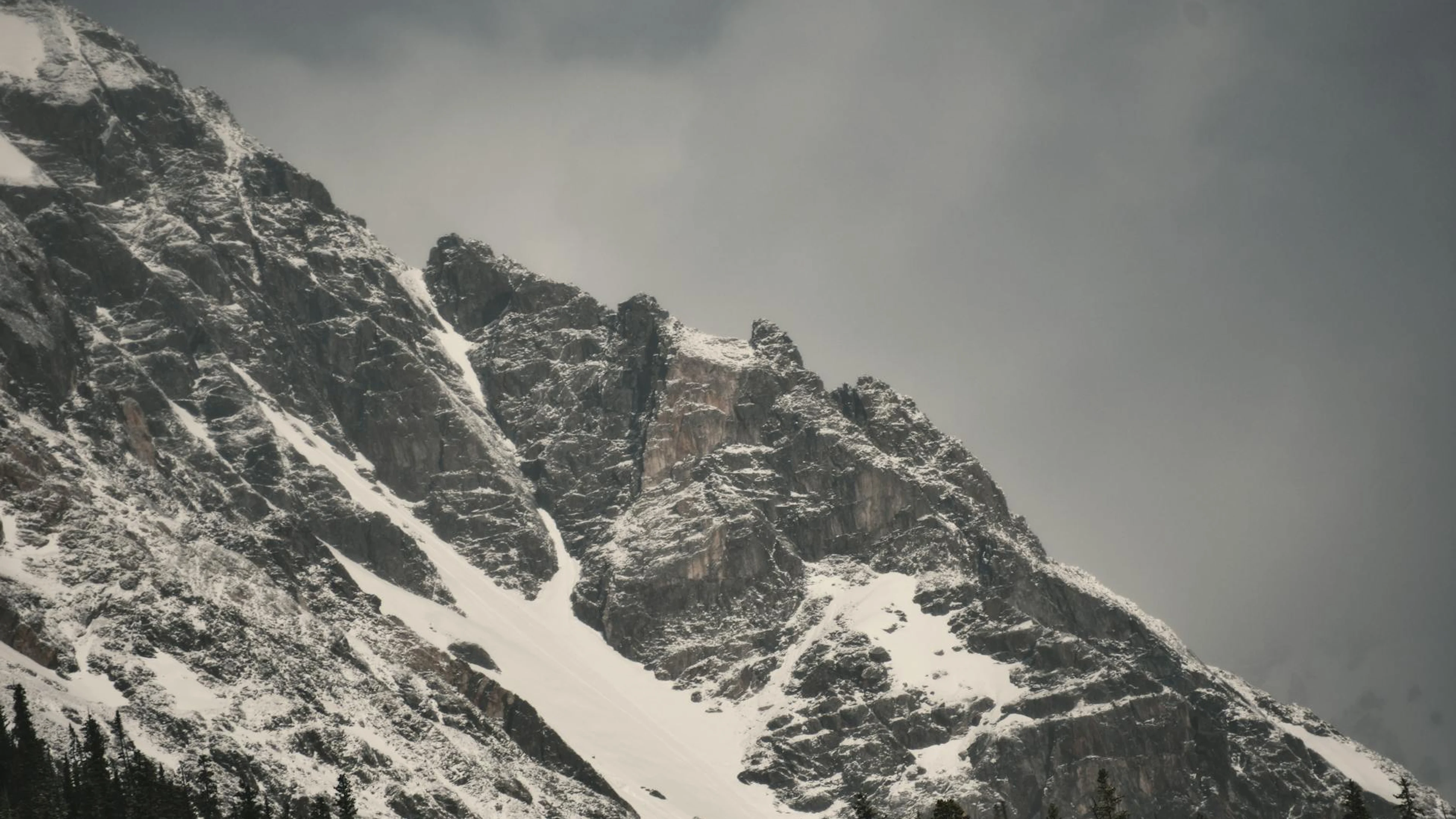 Free Captivating view of a snow-covered rocky mountain peak under an overcast sky. wallpaper in 4K Ultra HD resolution (3840x2160). Beautiful mountain background for your screen. No signup required.