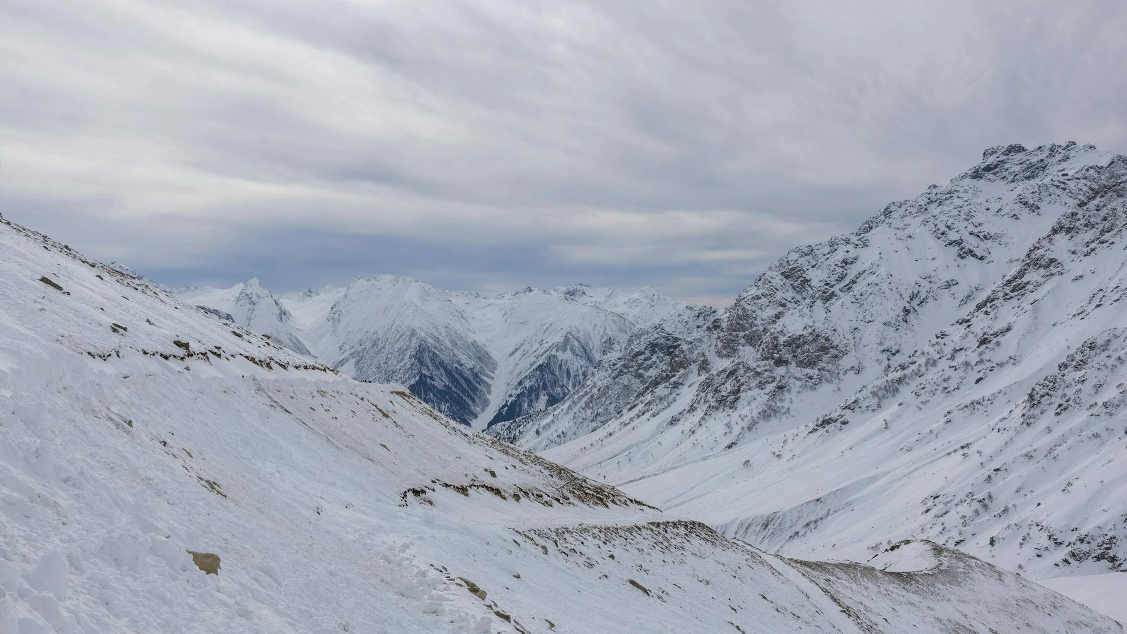 Free Captivating view of snow-covered peaks in a serene mountain landscape during win wallpaper in 4K Ultra HD resolution (3840x2160). Beautiful mountain background for your screen. No signup required.