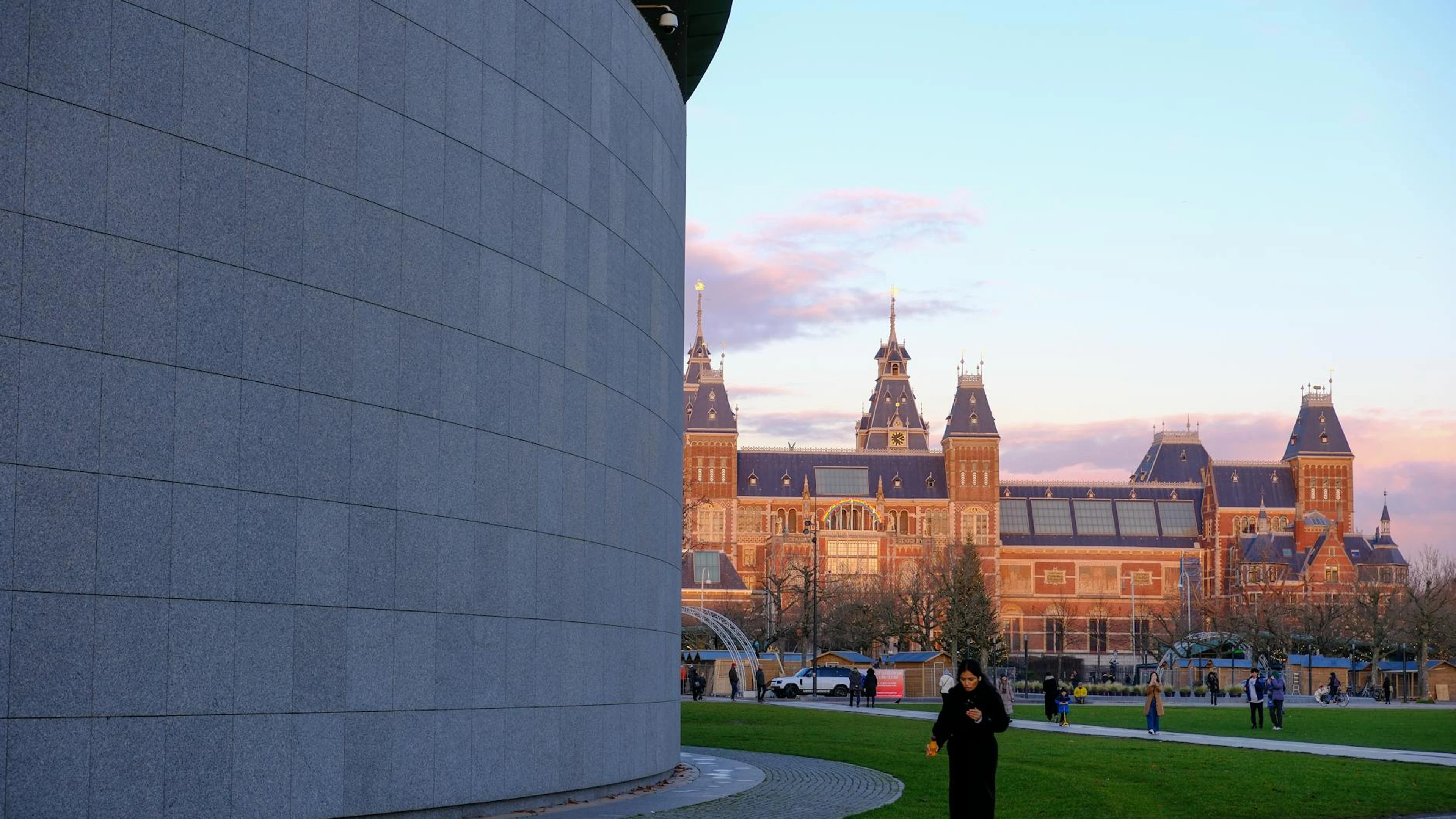 Download Captivating view of the Rijksmuseum and park at sunset in Amsterdam, capturing u wallpaper for free. 3840x2160 4K Ultra HD resolution, perfect for your desktop. High quality architecture wallpaper.