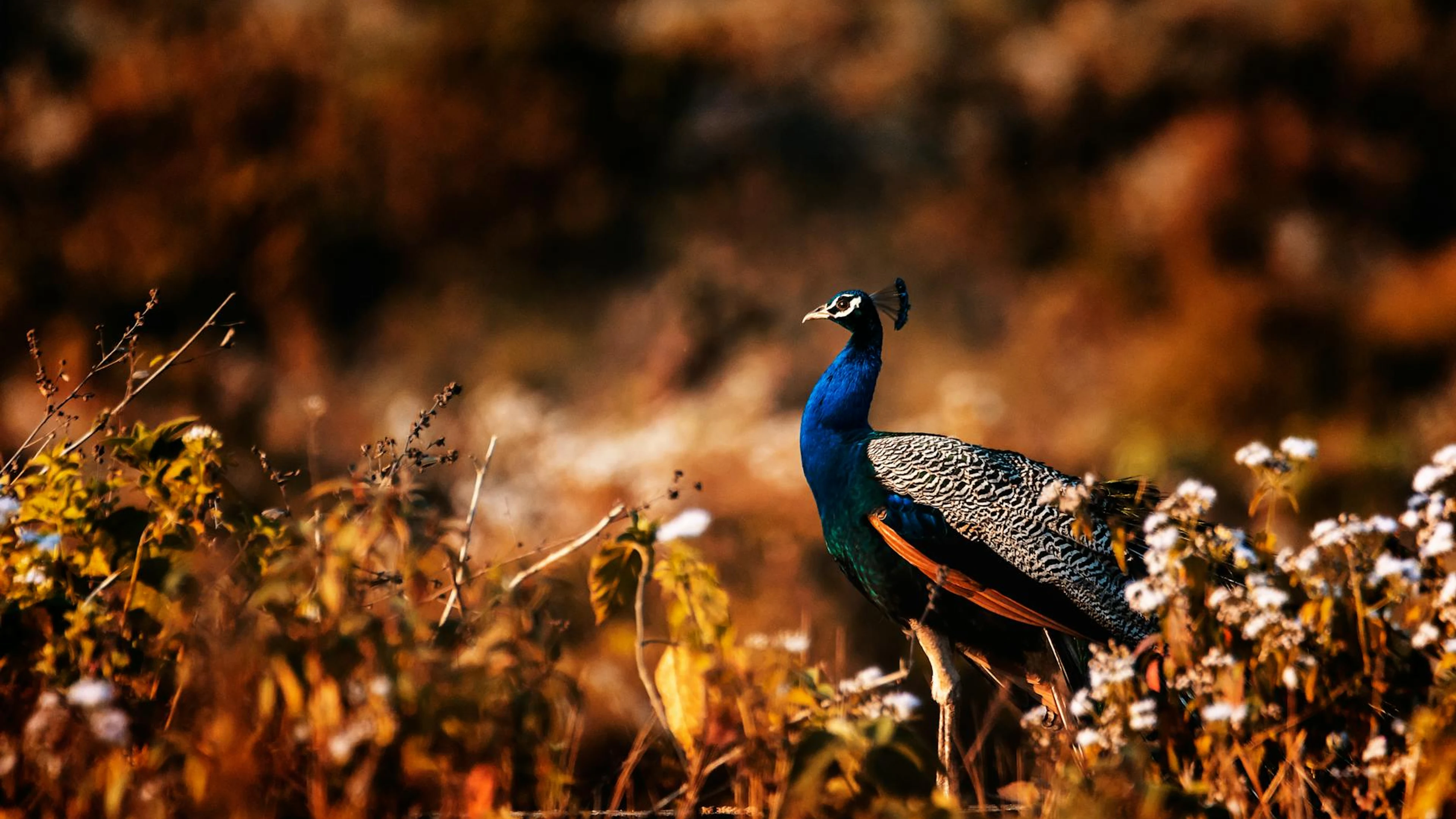 Get this stunning Capture of a peacock in its natural habitat during dusk at Gorumara National Par wallpaper in 4K Ultra HD quality. 3840x2160 animals wallpaper available for free download.