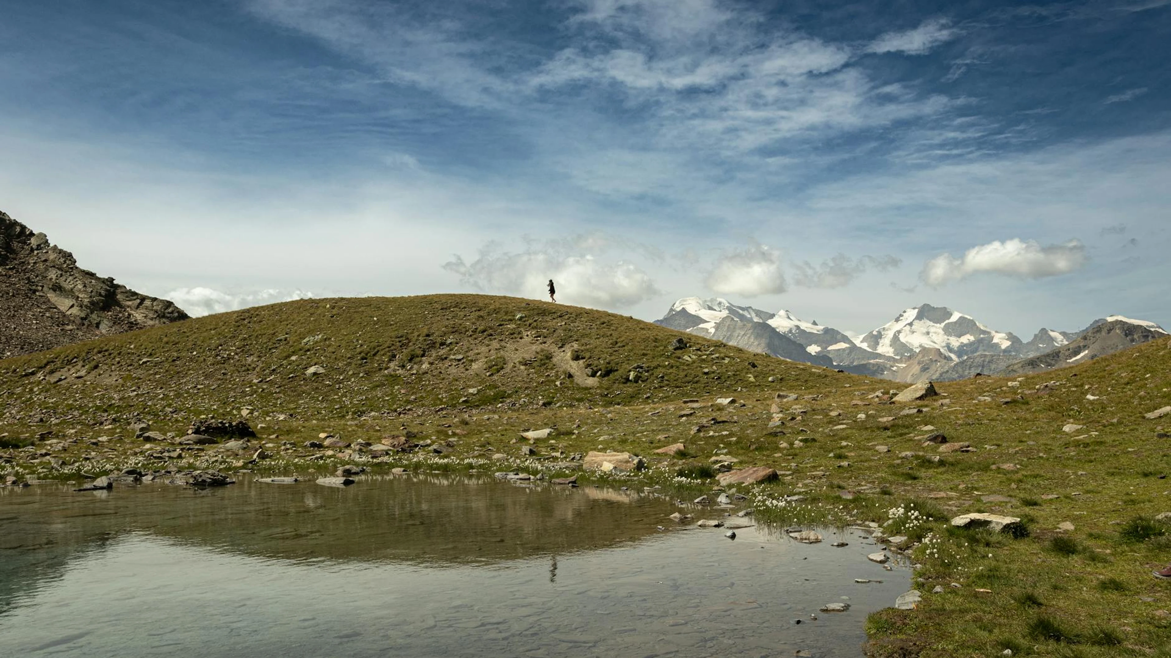 Capture of a tranquil alpine lake reflecting lush hills and distant snow-capped