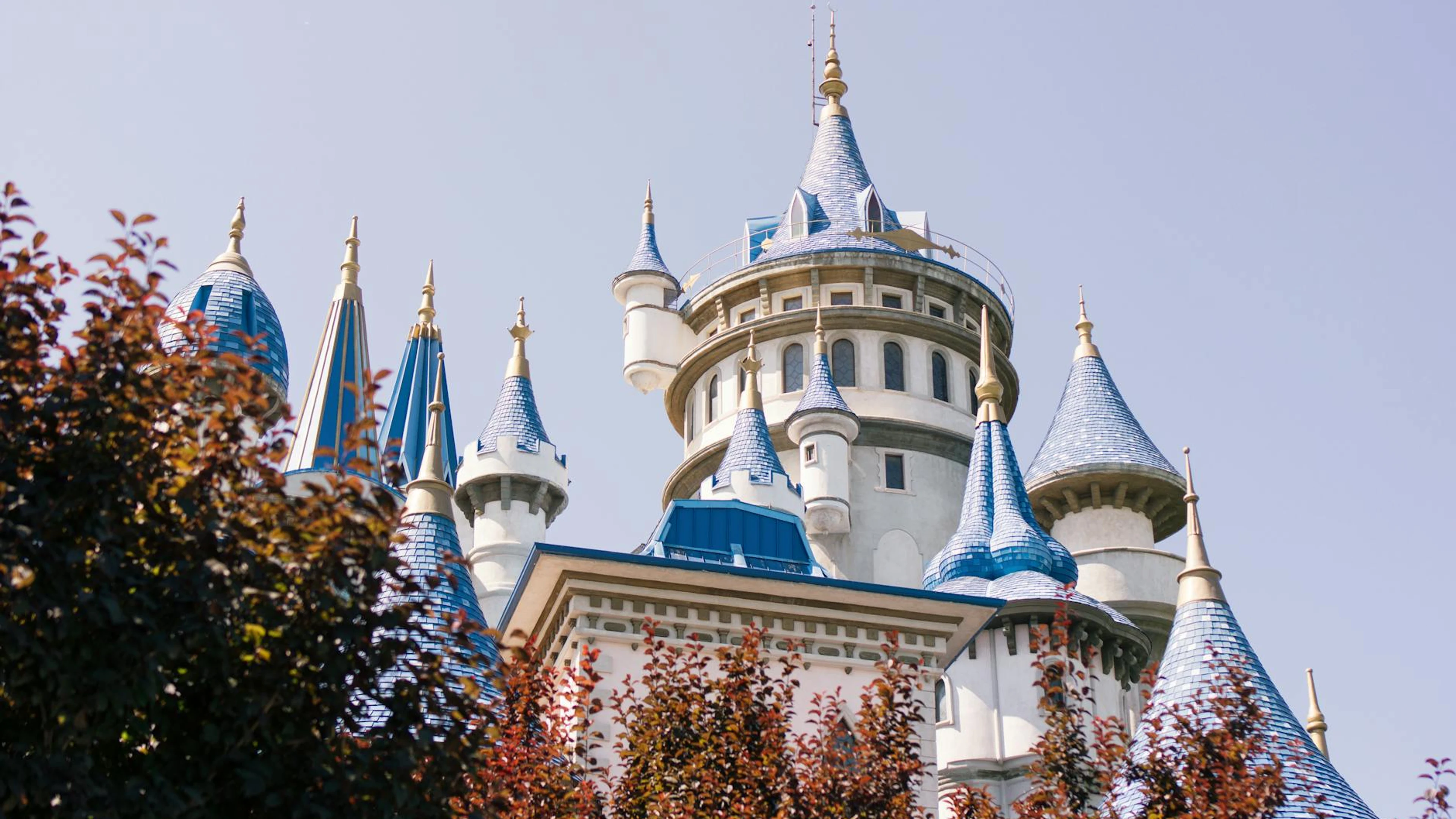 Download Charming fairytale castle with blue turrets in Eskişehir, Türkiye. wallpaper for free. 3840x2160 4K Ultra HD resolution, perfect for your desktop. High quality fantasy wallpaper.