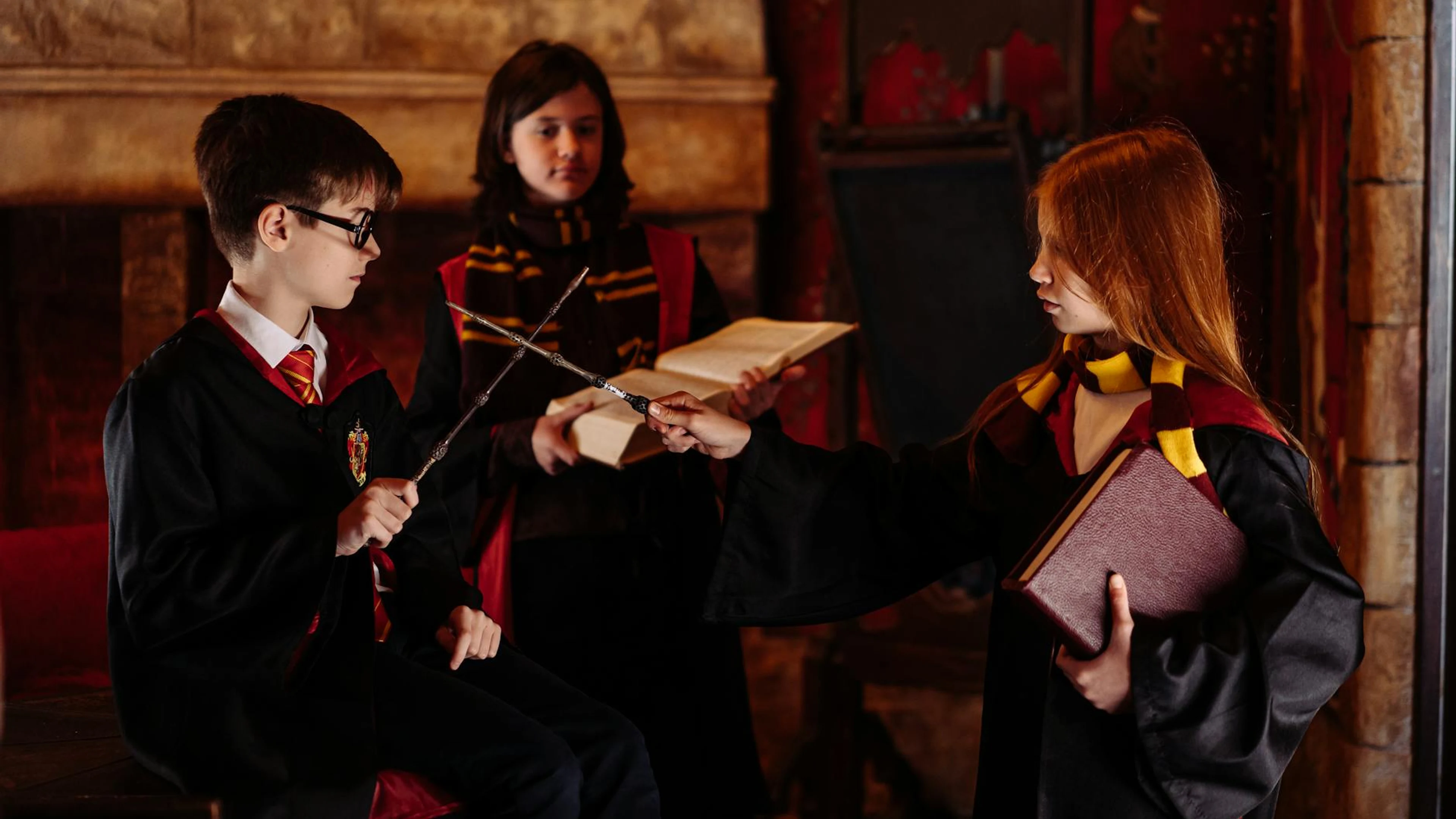 Children in wizard costumes practice magic inside a themed setting with wands an