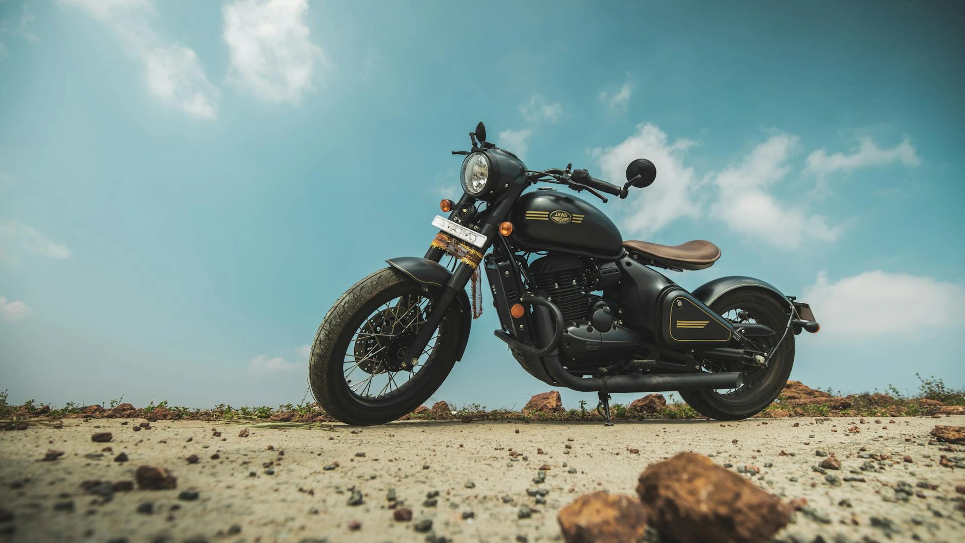 Get this stunning Classic black motorcycle parked on rocky ground under a bright blue sky. wallpaper in 4K Ultra HD quality. 3840x2160 motorcycle wallpaper available for free download.
