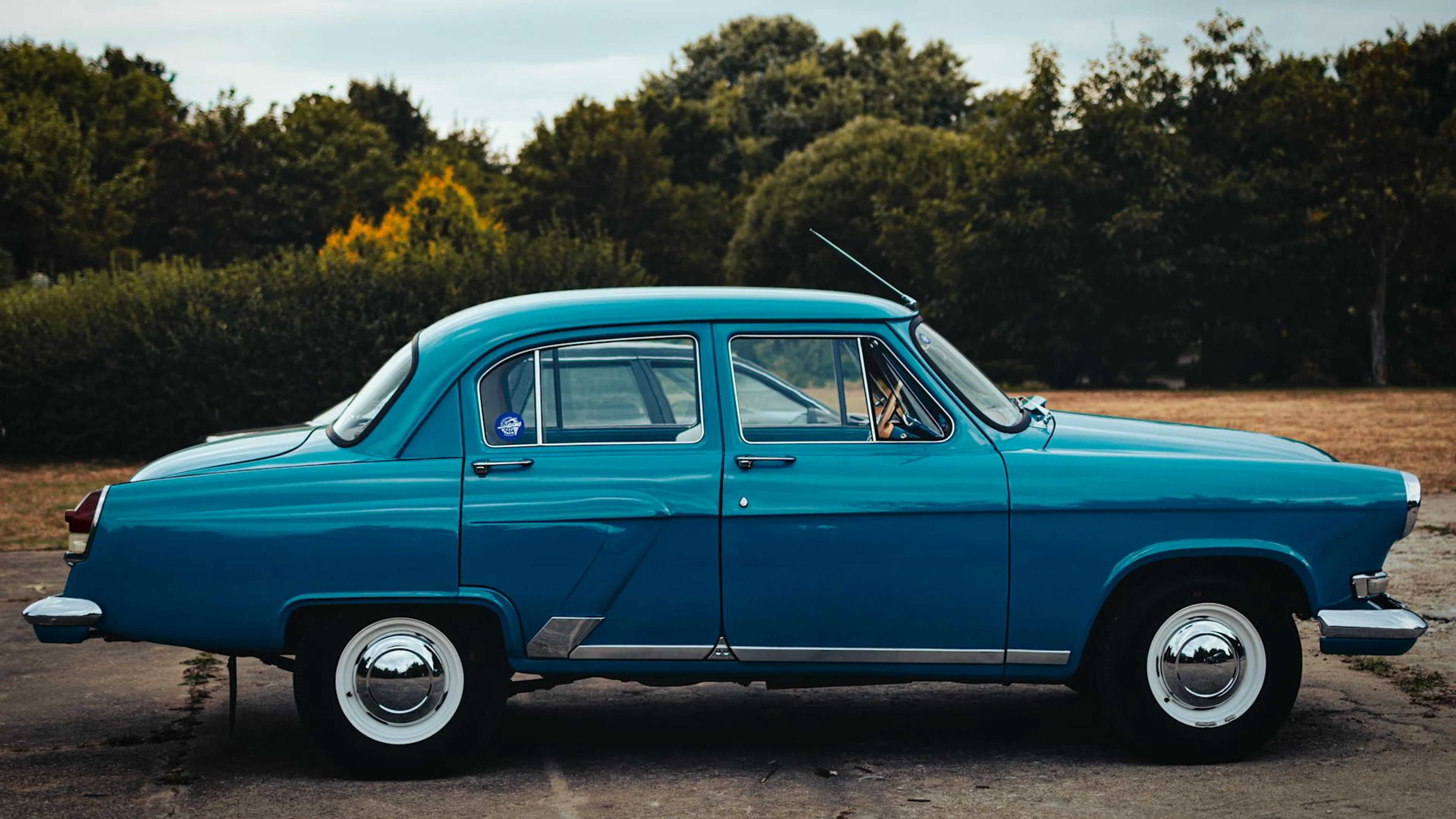 Classic blue Gaz 21 car parked outdoors in Minsk, Belarus during summer. - free 4K Ultra HD cars wallpaper for desktop