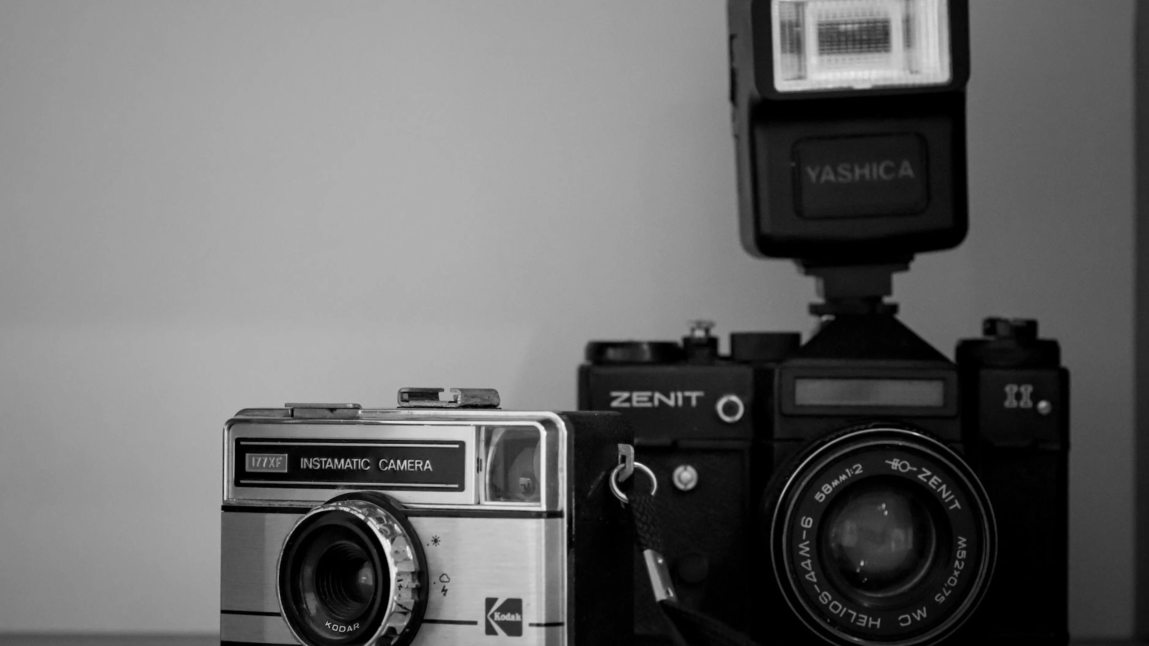 Get this stunning Classic Instamatic and Zenit cameras with flash in monochrome finish. wallpaper in 4K Ultra HD quality. 3840x2160 aesthetic wallpaper available for free download.