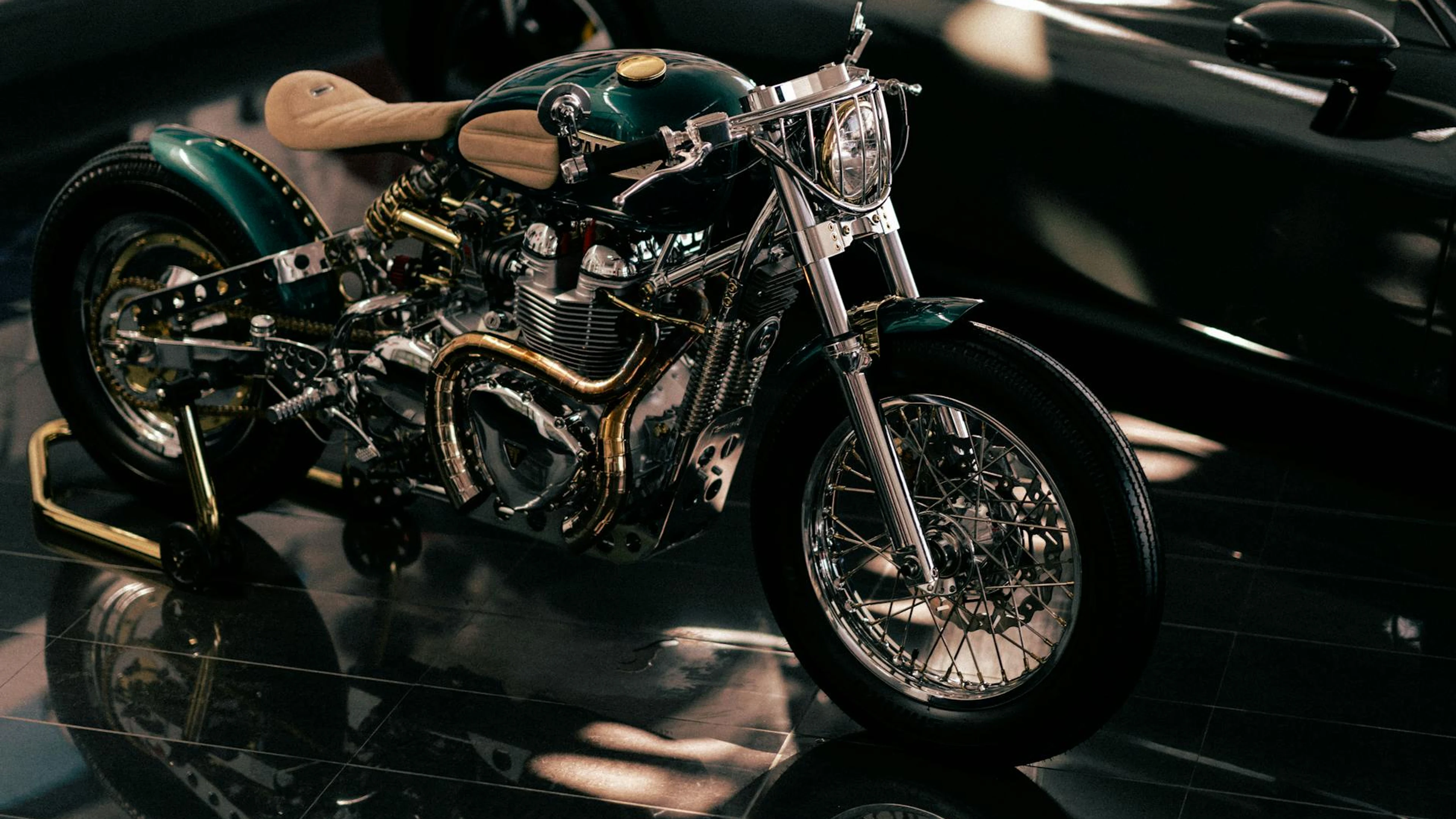 Get this stunning Classic motorcycle displayed in a dimly lit showroom, highlighting its vintage d wallpaper in 4K Ultra HD quality. 3840x2160 motorcycle wallpaper available for free download.