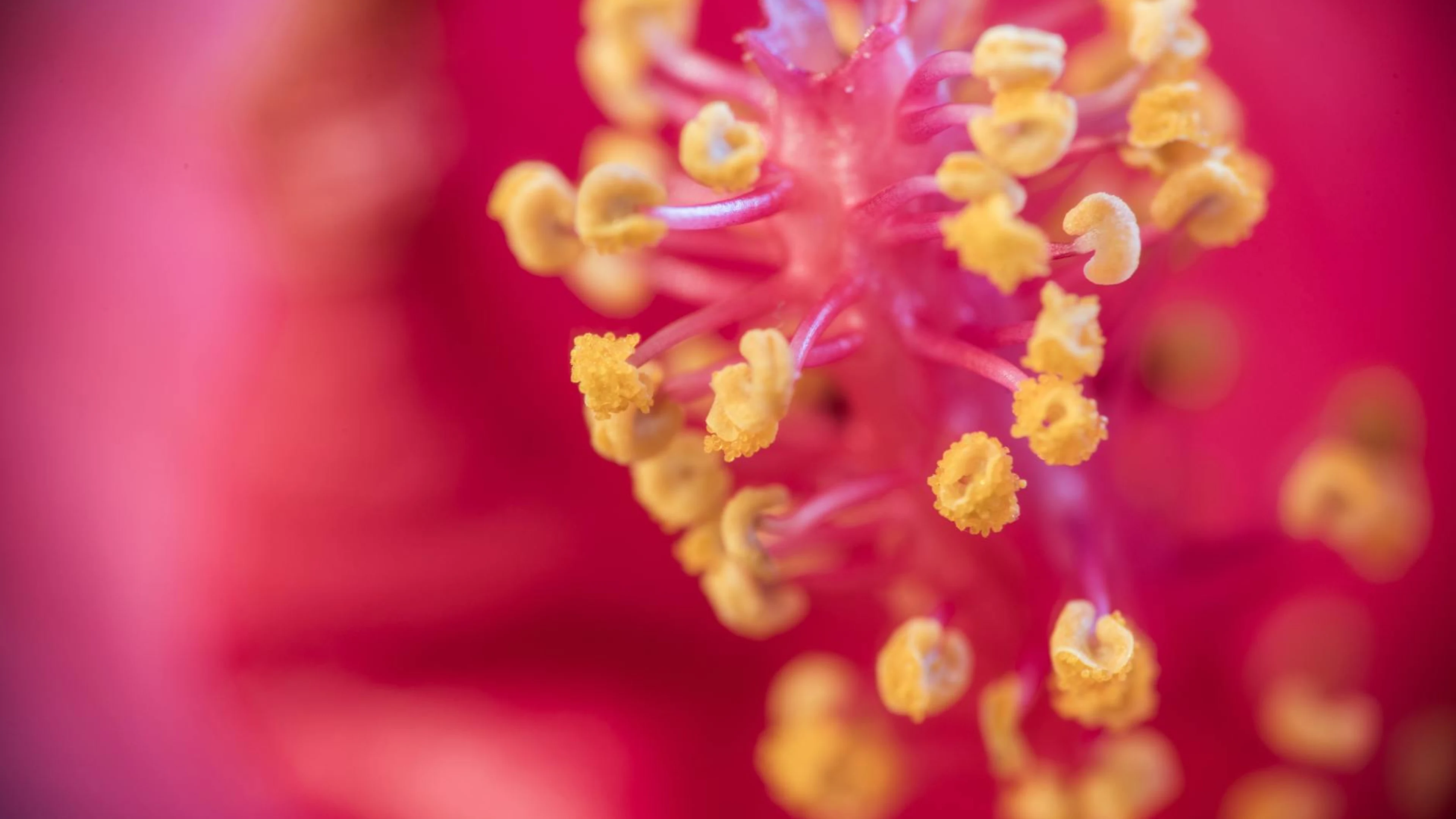Get this stunning Close-up image of a vibrant red hibiscus flower stamen with pollen. wallpaper in 4K Ultra HD quality. 3840x2160 macro wallpaper available for free download.
